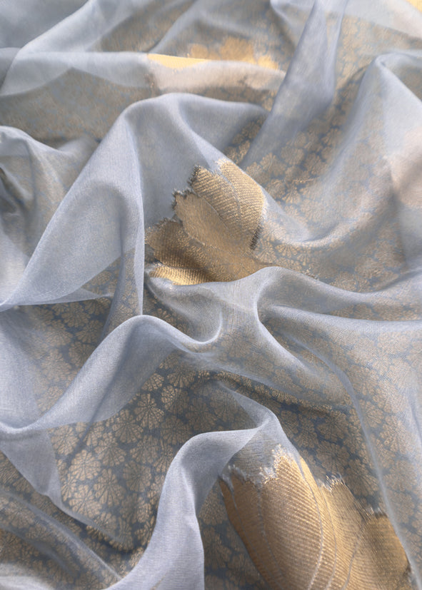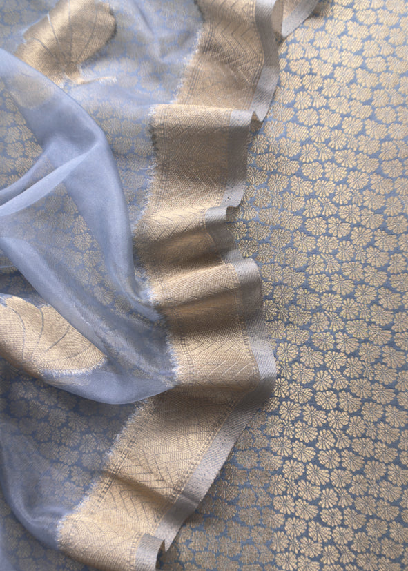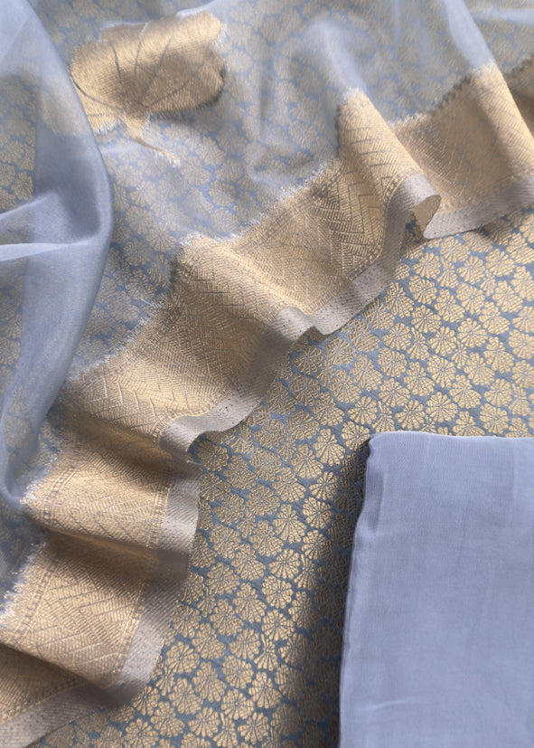 The wedding wear three-piece suit has brocade kurta and organza Dupatta adorned with beautiful golden zari work along with plain crepe bottom.