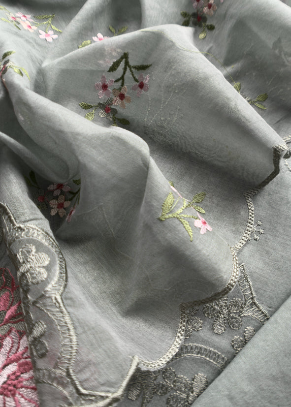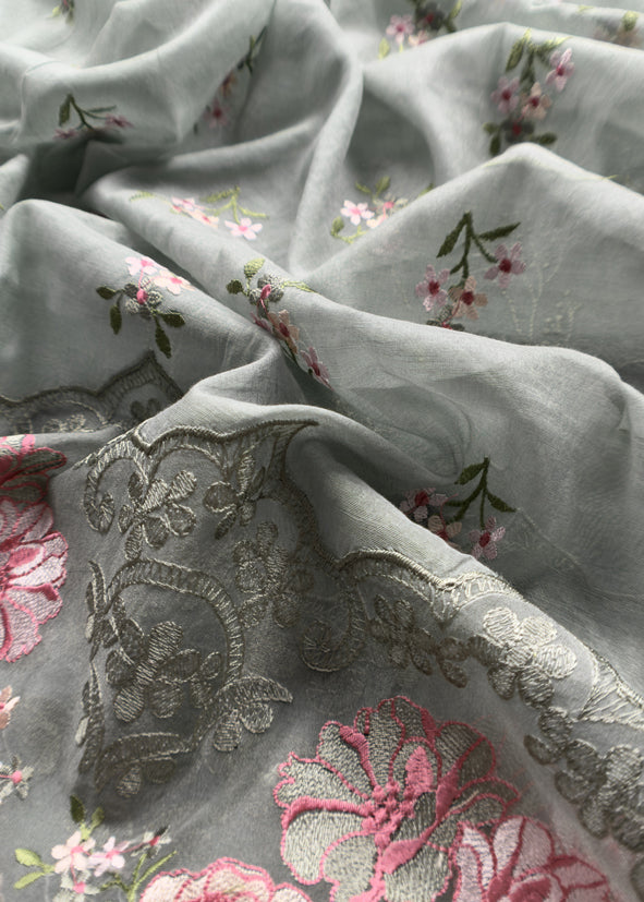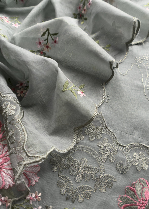 Gray Pure Mulmul Suit Fabric With Floral Resham Embroidery