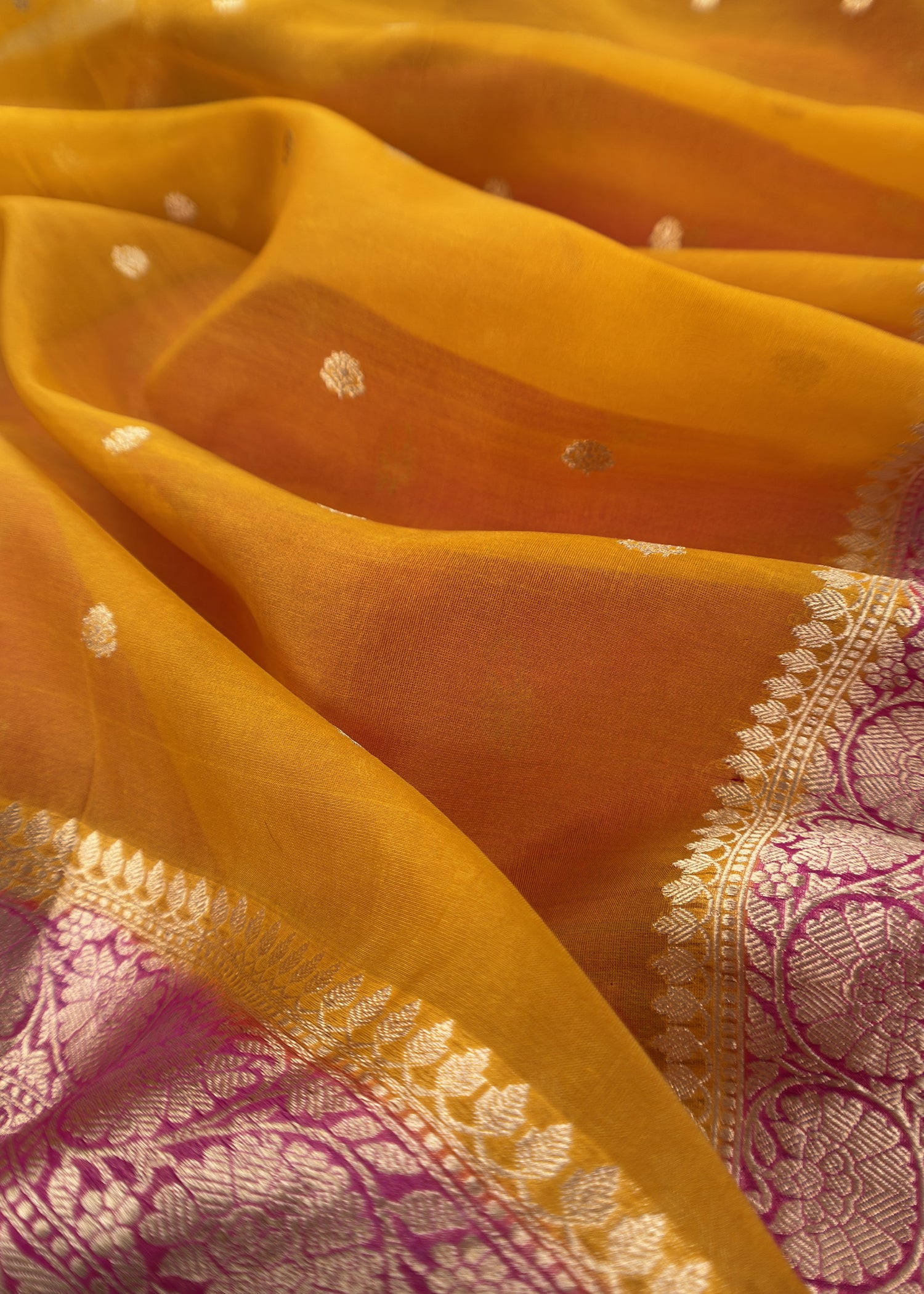 Handloom raw silk kurta with gold Kadwa woven all over bootis and daman paired with Handloom kora silk dupatta having four side woven borders with kadwa panels and matching pure raw silk lowers. The suit fabric has kadwa woven bootis for sleeves and kurta back as well.
