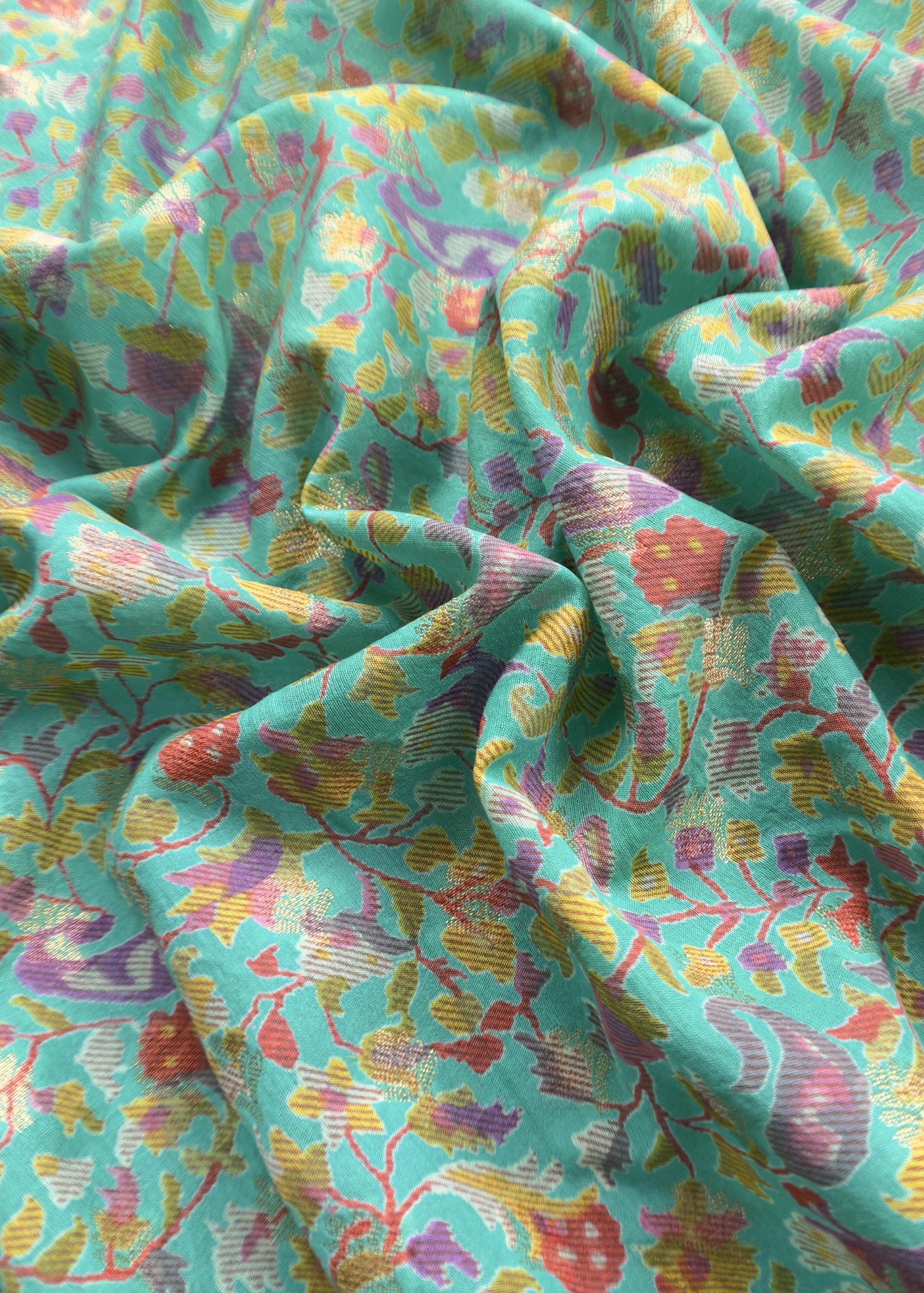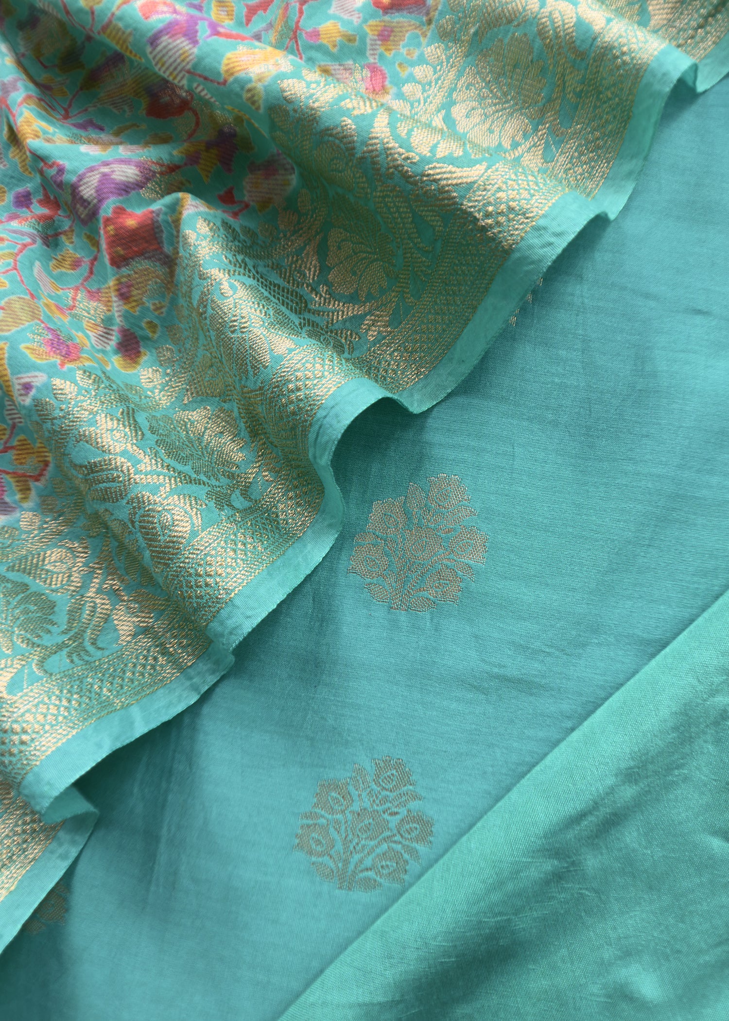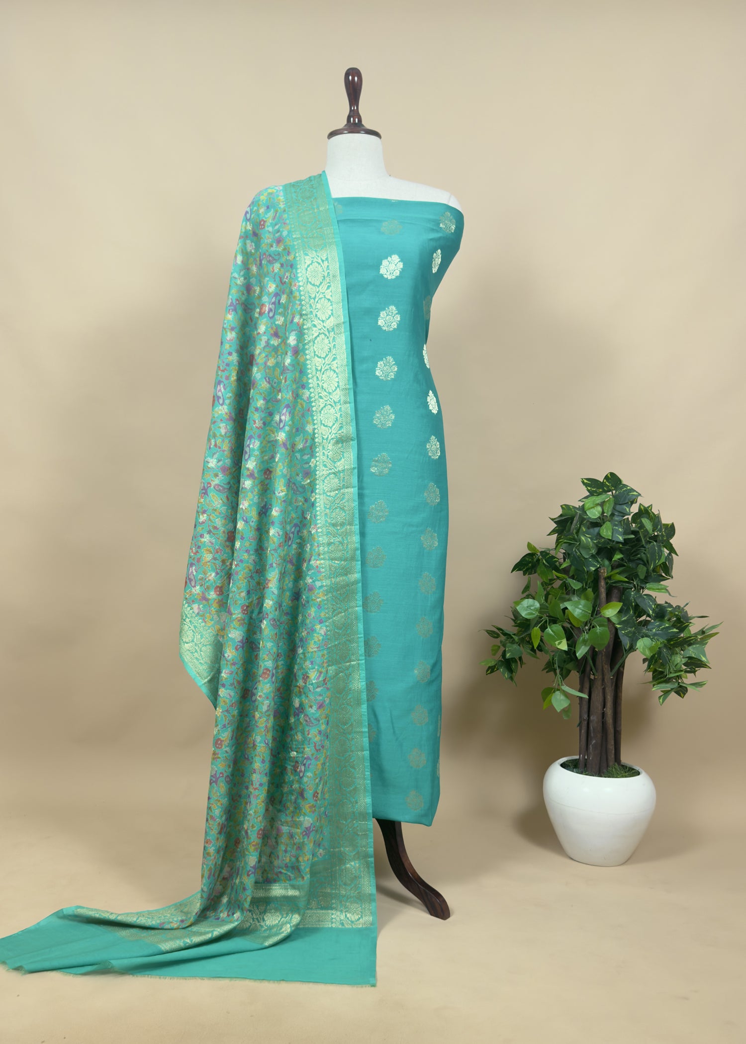 Banarasi Unstitched Suit In Chanderi adorned with exquisite Zari Bootis, paired flawlessly with a mesmerizing Kalamkari Dupatta and Plain bottom.
