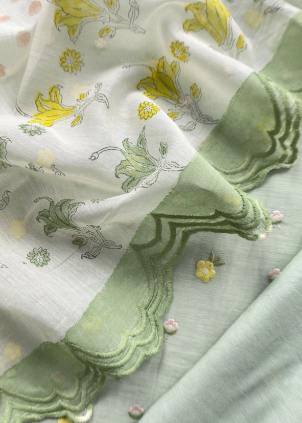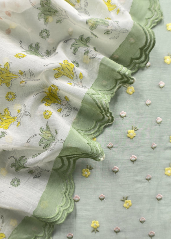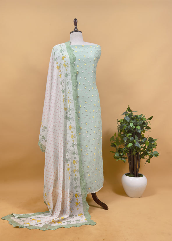 Green Embroidered Unstitched Mulmul Suit With Scalloped Border.