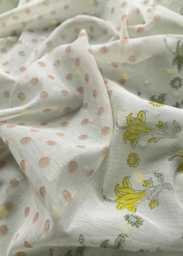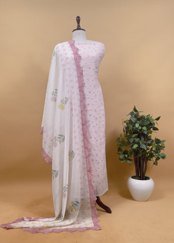 All-over thread embroidered bootis on the kurta and dupatta in summer handloom mul fabric, featuring a beautiful hand-block floral print on the dupatta and a four-side scalloped border. The three-piece suit comes with a matching cotton bottom.