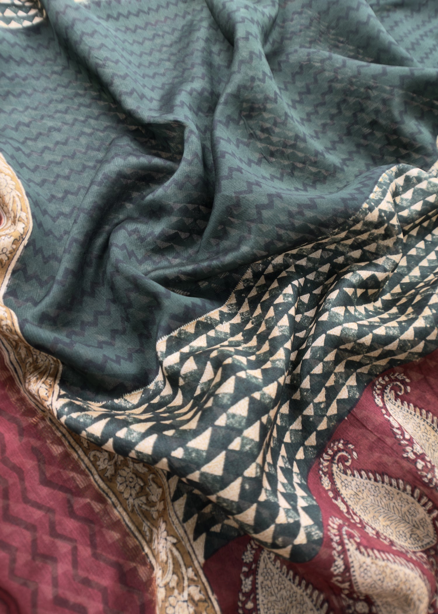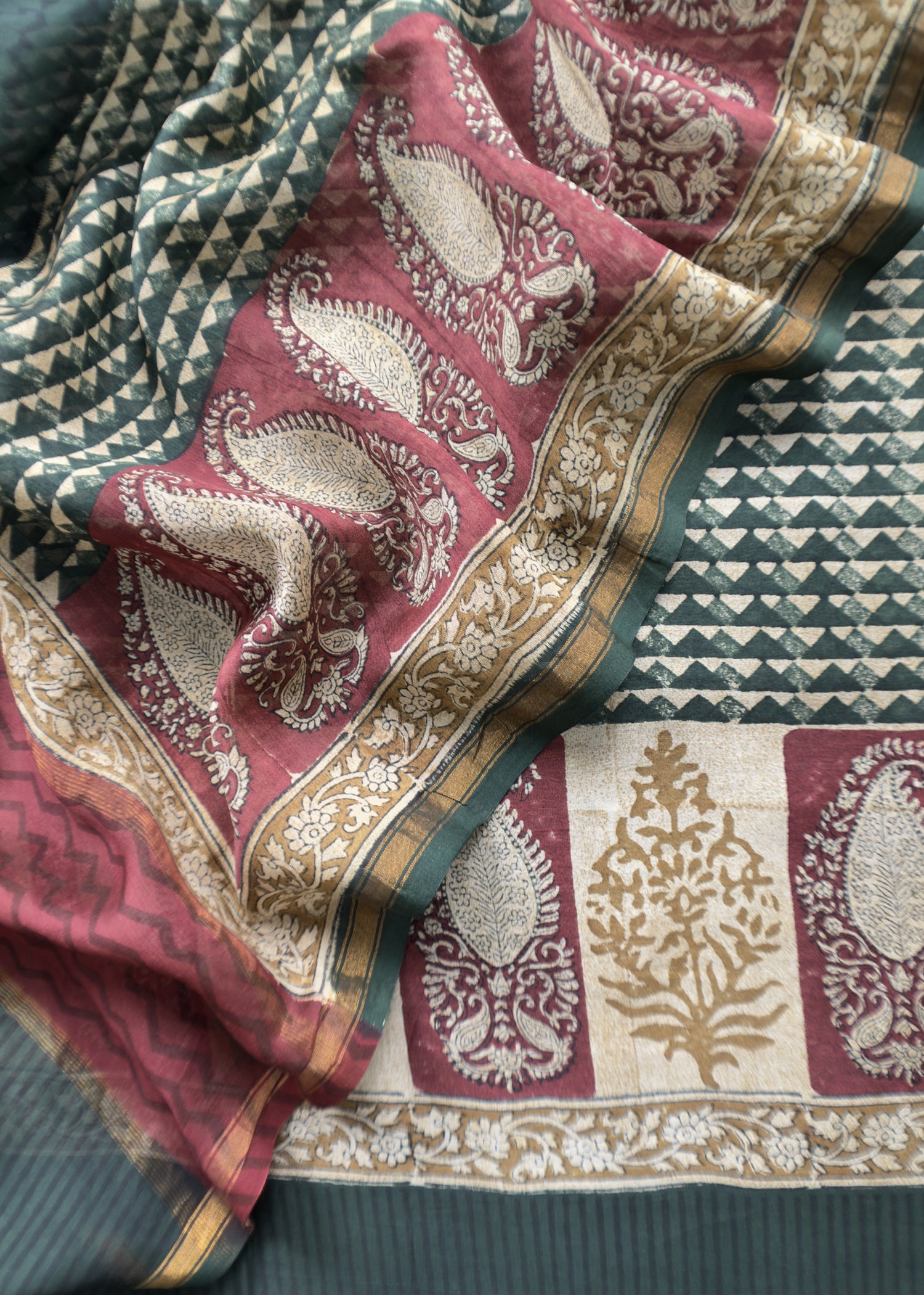Green Handloom Maheshwari Silk Suit With Hand Block Print