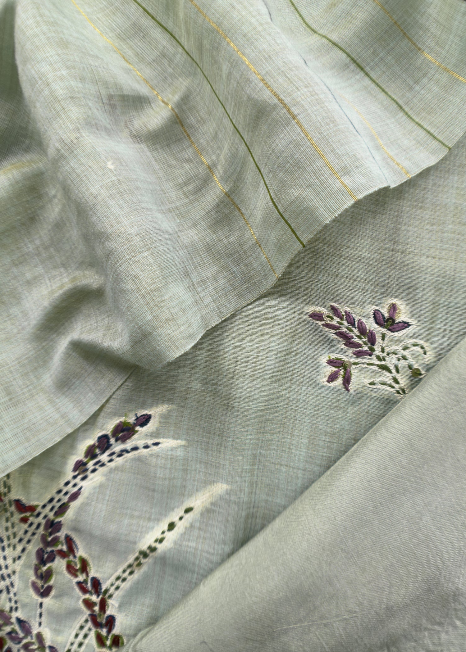 Green Jamdani Suit With Hand Kantha Embroidery And French Knots