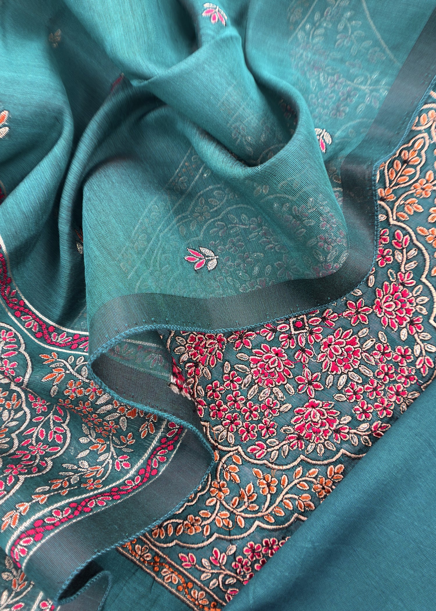 Green Linen Chanderi Suit Fabric with Jamdani Weaving And Embroidery