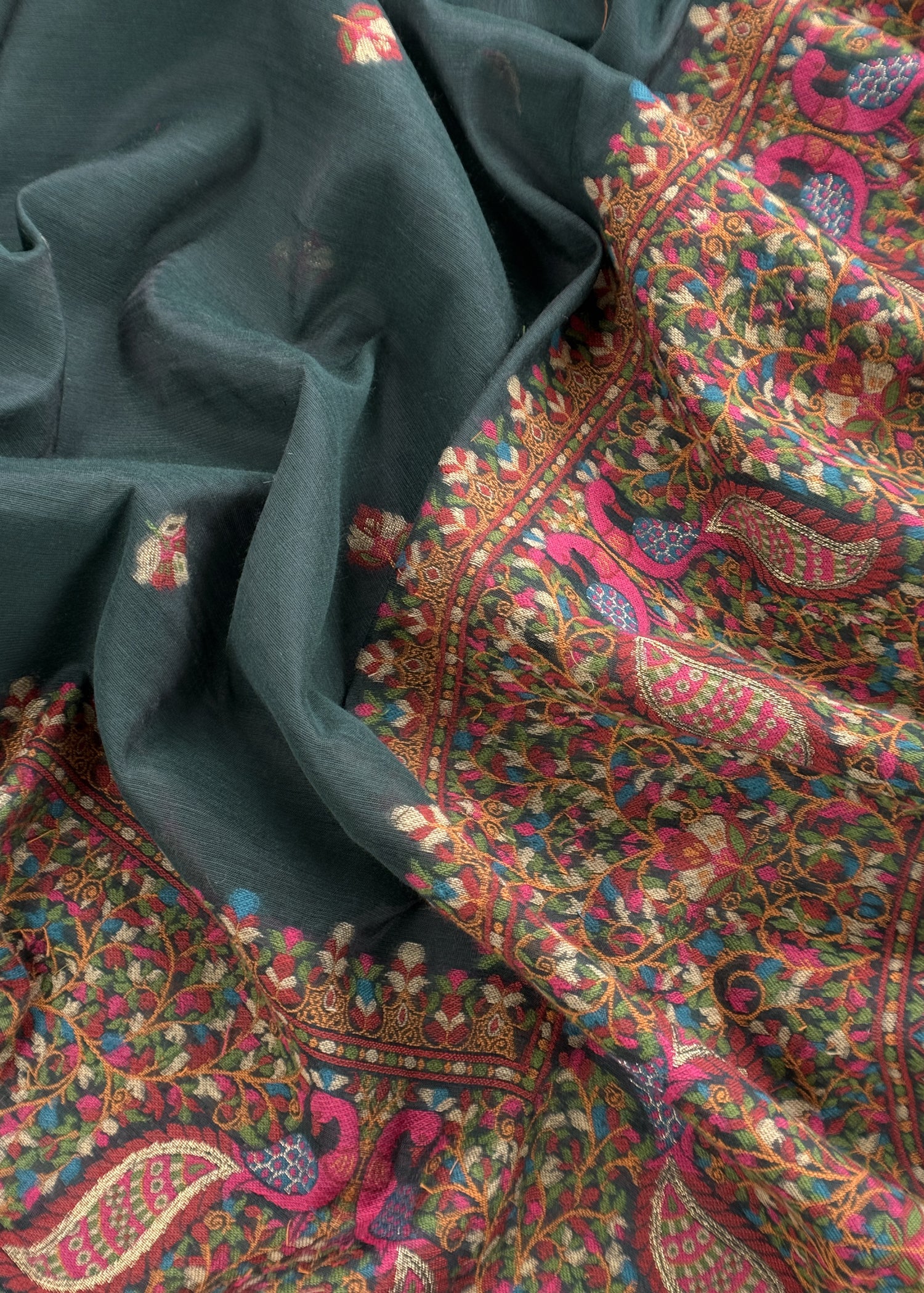 Green linen Chanderi Suit Fabric With Multicolour Jamdani Weaving