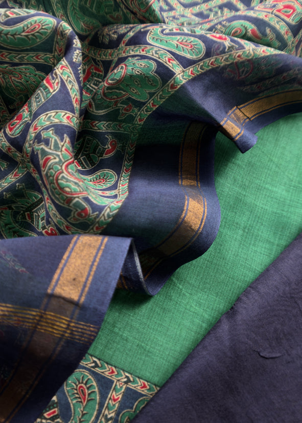 Green Pure Maheshwari Silk Unstitched Suit Fabric With Shikagarh Print