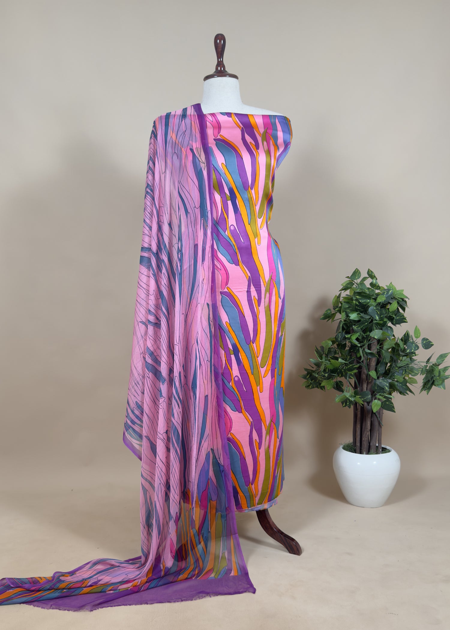 A pure crepe suit with mesmerizing digital prints on the kurta, paired with a chinon dupatta and a pure crepe bottom.