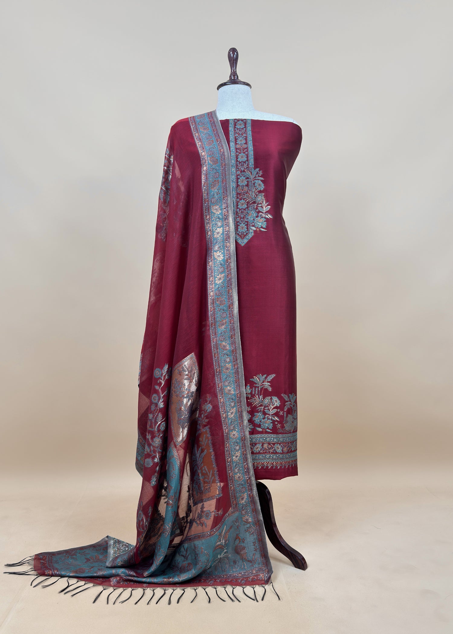 Only dry cleaning is recommended for this fabric to maintain its vibrant colors and ensure gentle care, preventing shrinkage or fading. Treat your Kalasheel dupatta suit with love and pass it on as a cherished family heirloom.