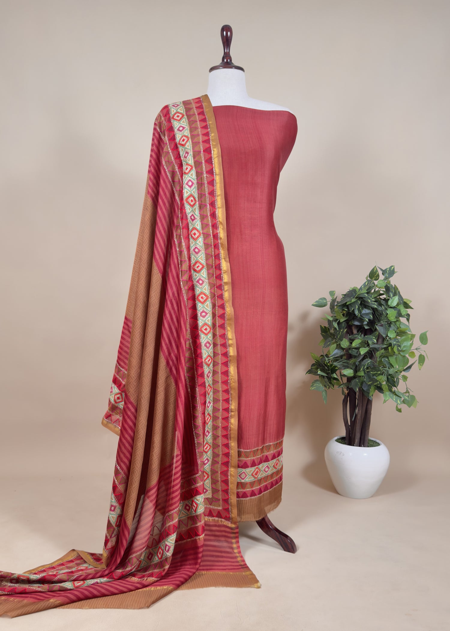 Greenish Brown Maheshwari Silk Unstitched Suit Set With Kantha Embroidery