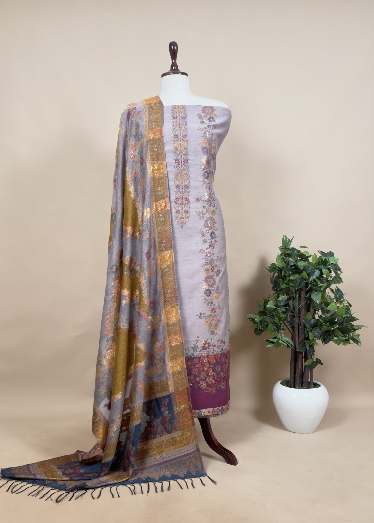Only dry cleaning is recommended for this fabric to maintain its vibrant colors and ensure gentle care, preventing shrinkage or fading. Treat your Kalasheel dupatta suit with love and pass it on as a cherished family heirloom.