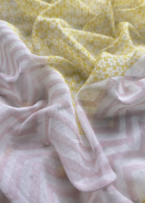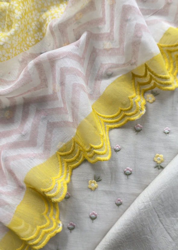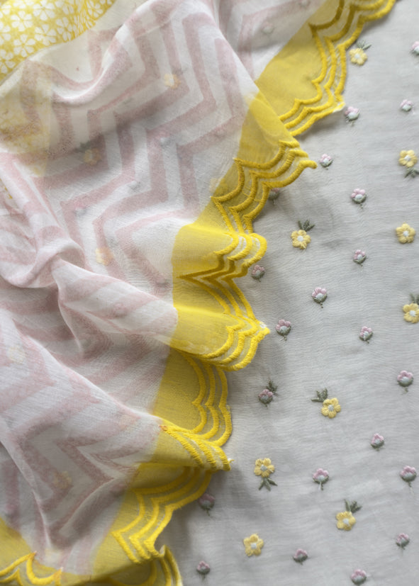 Grey With Yellow Embroidered Unstitched Mulmul Suit With Scalloped Border.
