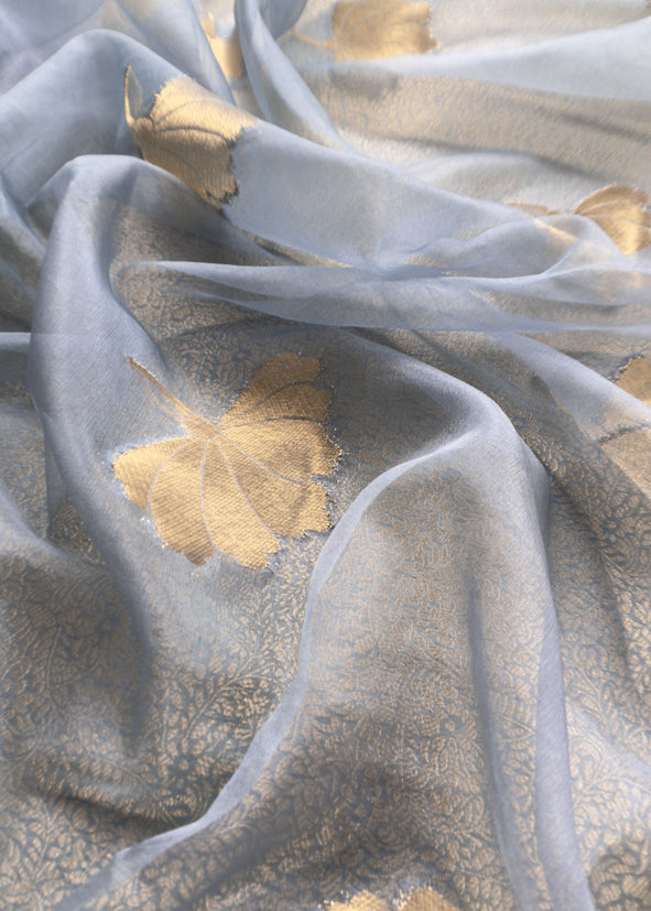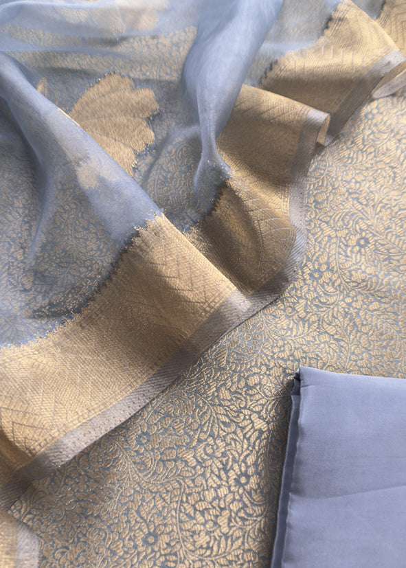 Greyish Blue Brocade Kurta With Organza Dupatta