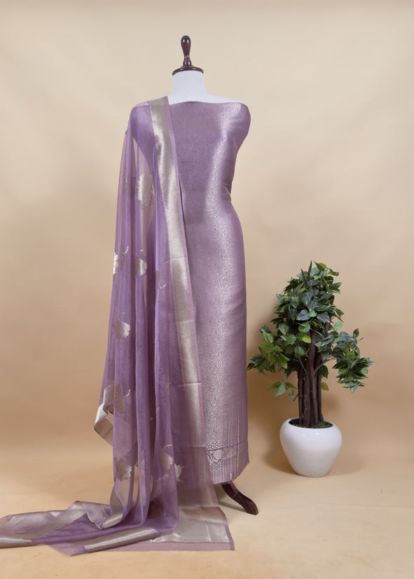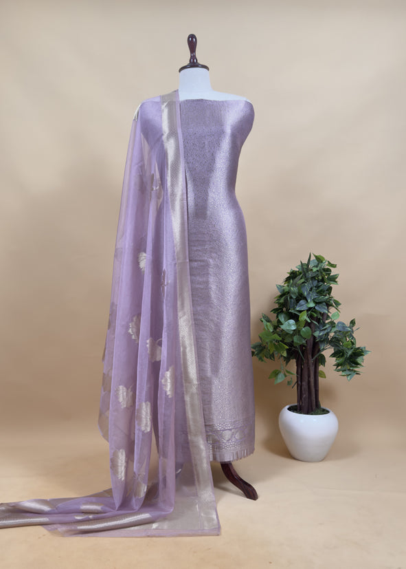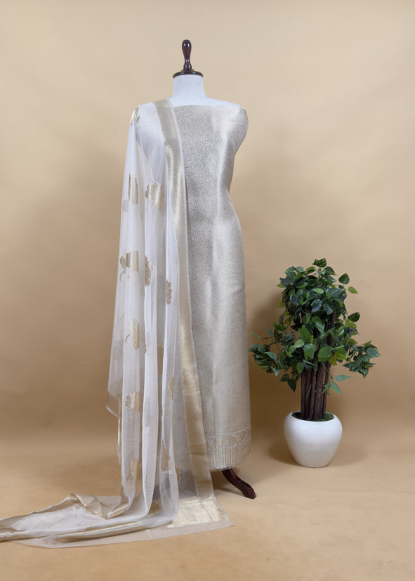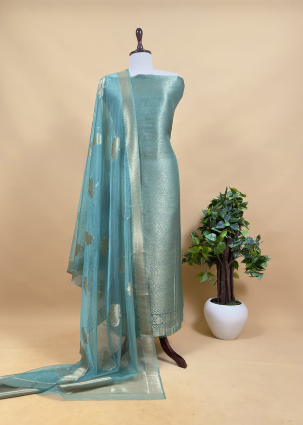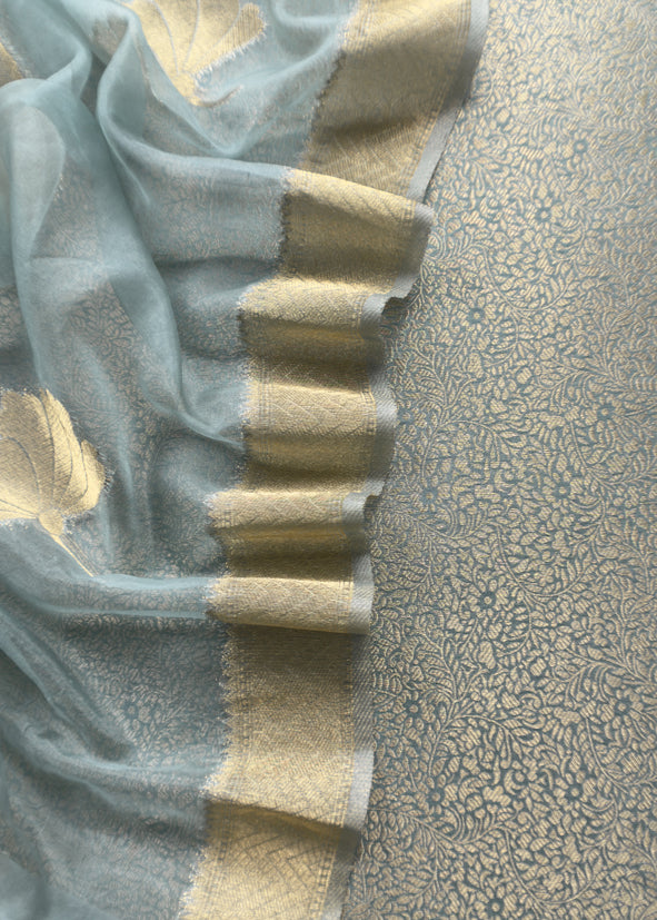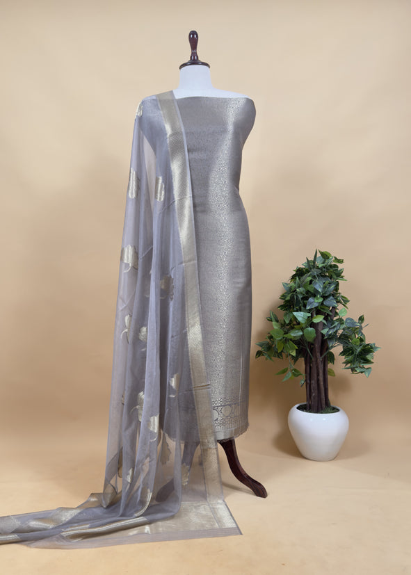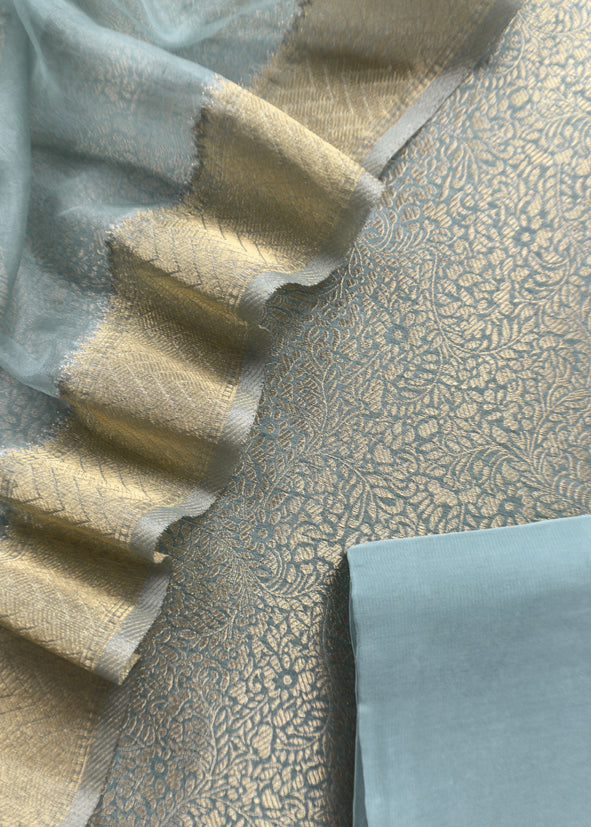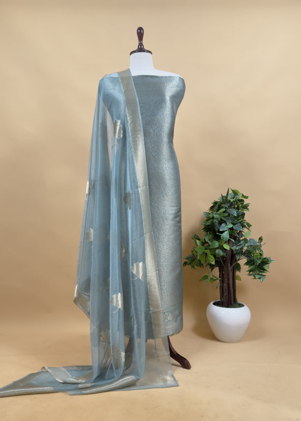 Blueish Grey Brocade Kurta With Organza Dupatta