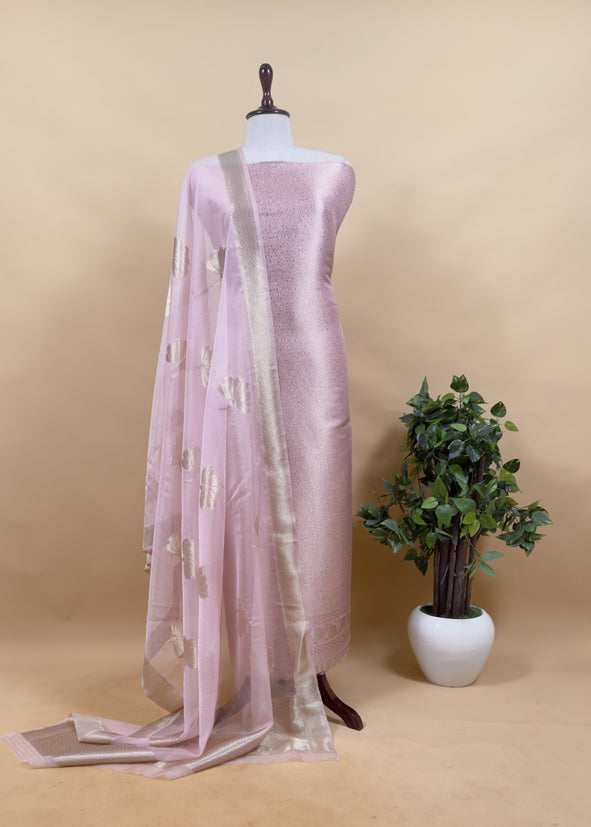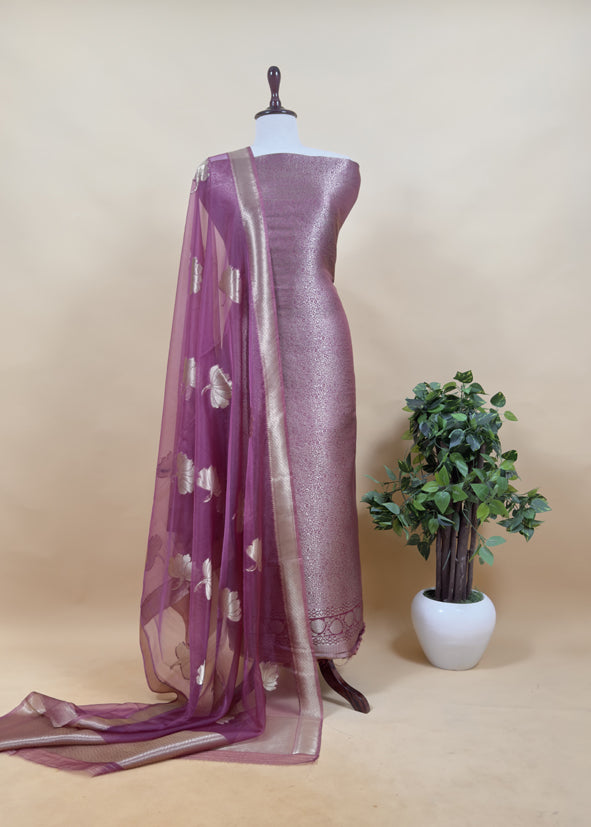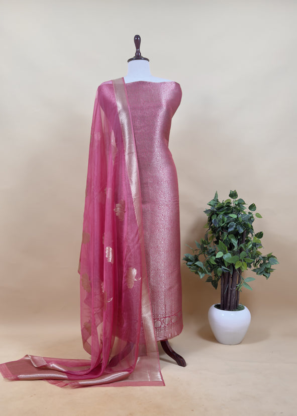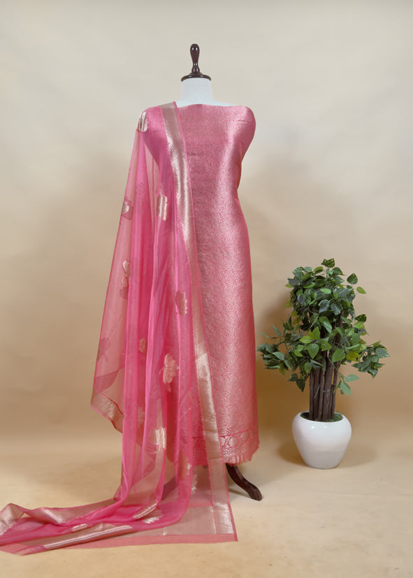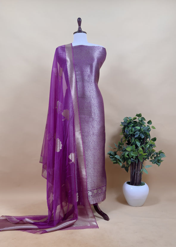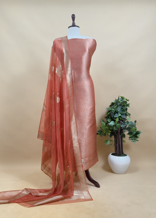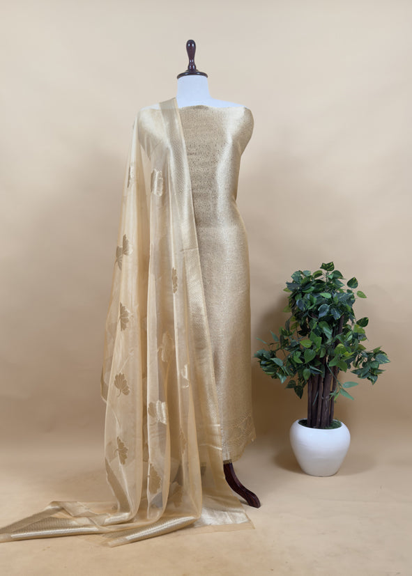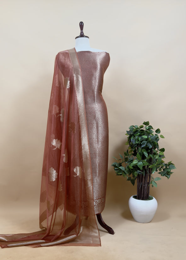 The wedding wear three-piece suit has brocade kurta and organza Dupatta adorned with beautiful golden zari work along with plain crepe bottom.
