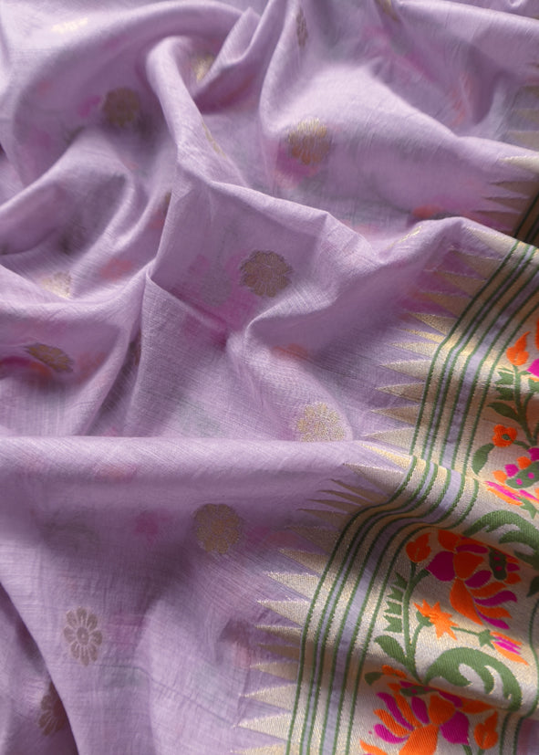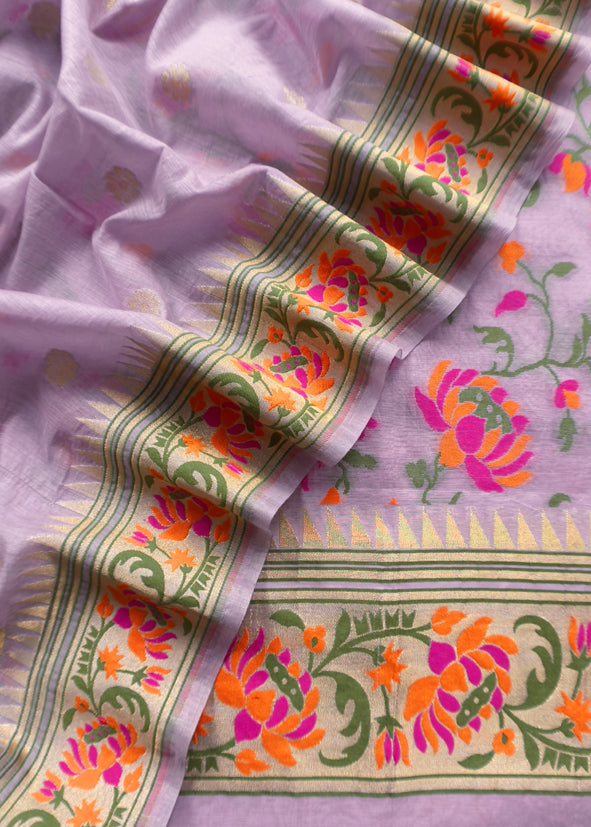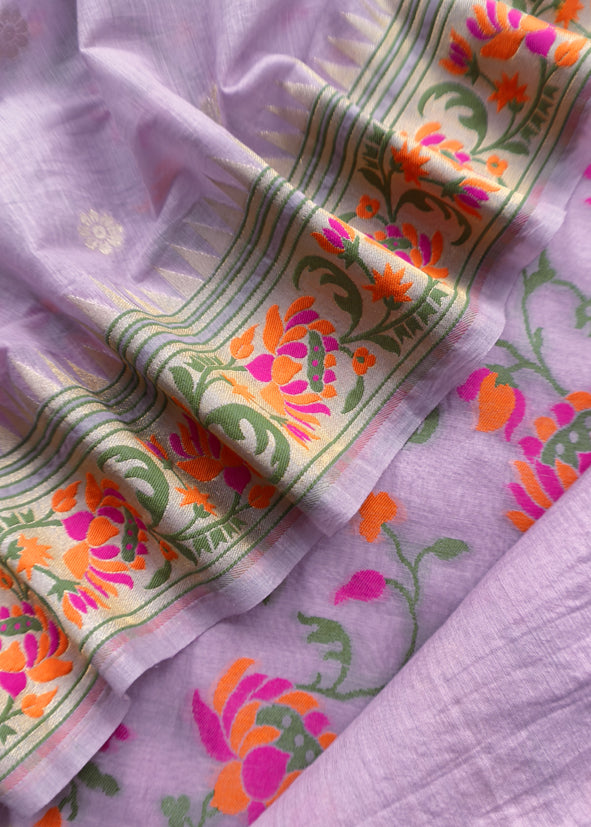 Paithani Handloom Banarasi cotton suit embellished with Meenakari flower weaving with gold zari work all over the kurta and dupatta is paired with plain cotton bottom.