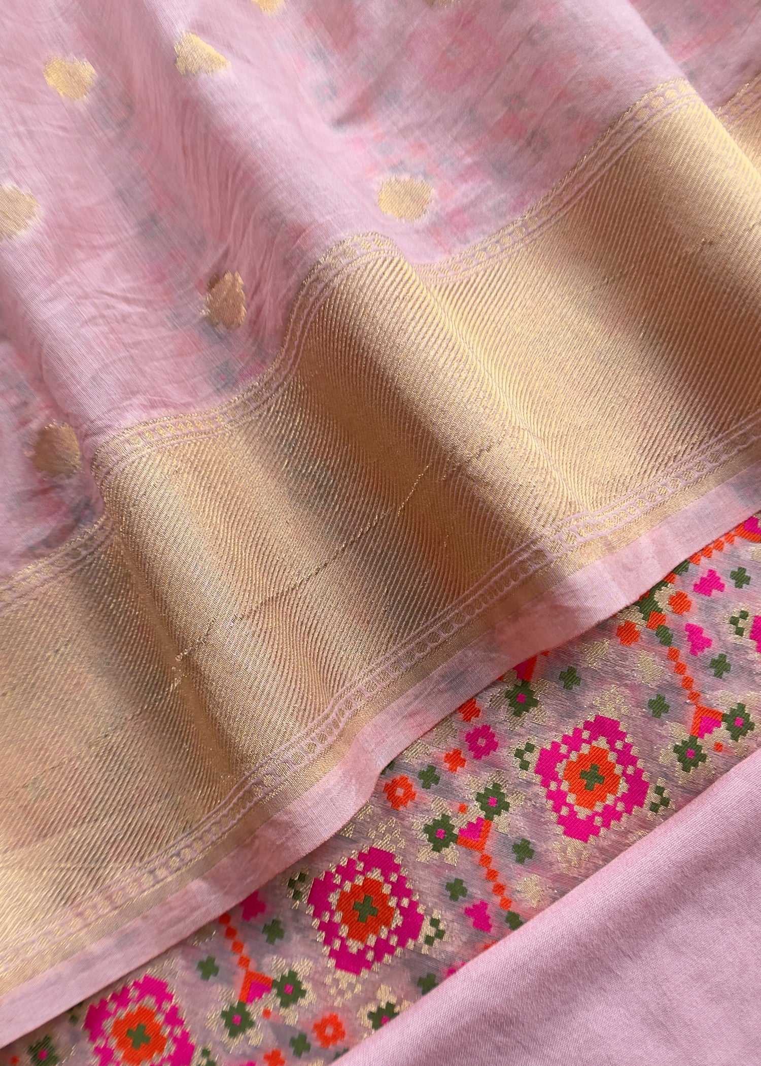Indulge in the timeless charm of Patola weaves with our Banarasi Cotton Suit. Gold Zari Weave and multicolored thread Patola grace the kurta and dupatta border, radiating traditional allure.