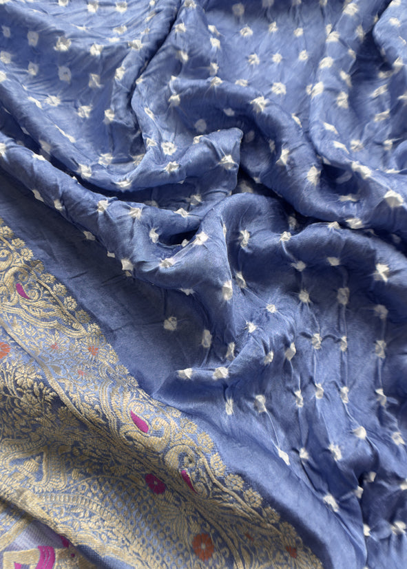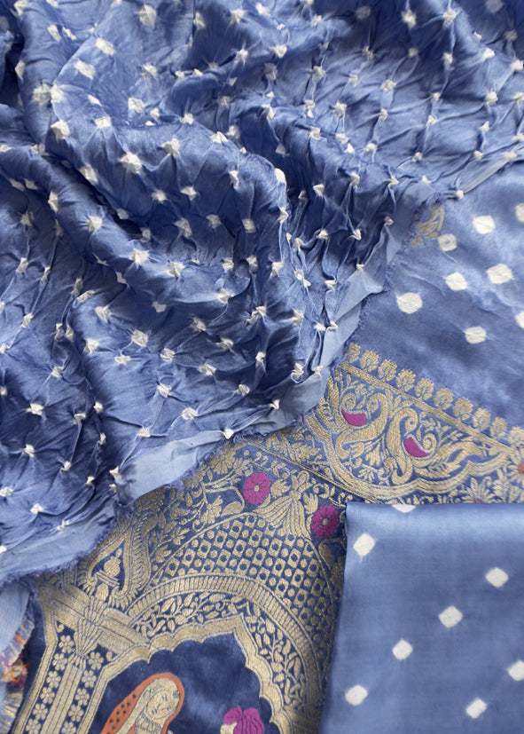Heer Steel Blue Pure Gajji Silk Bandhani Suit With Gold Banarasi Weaving