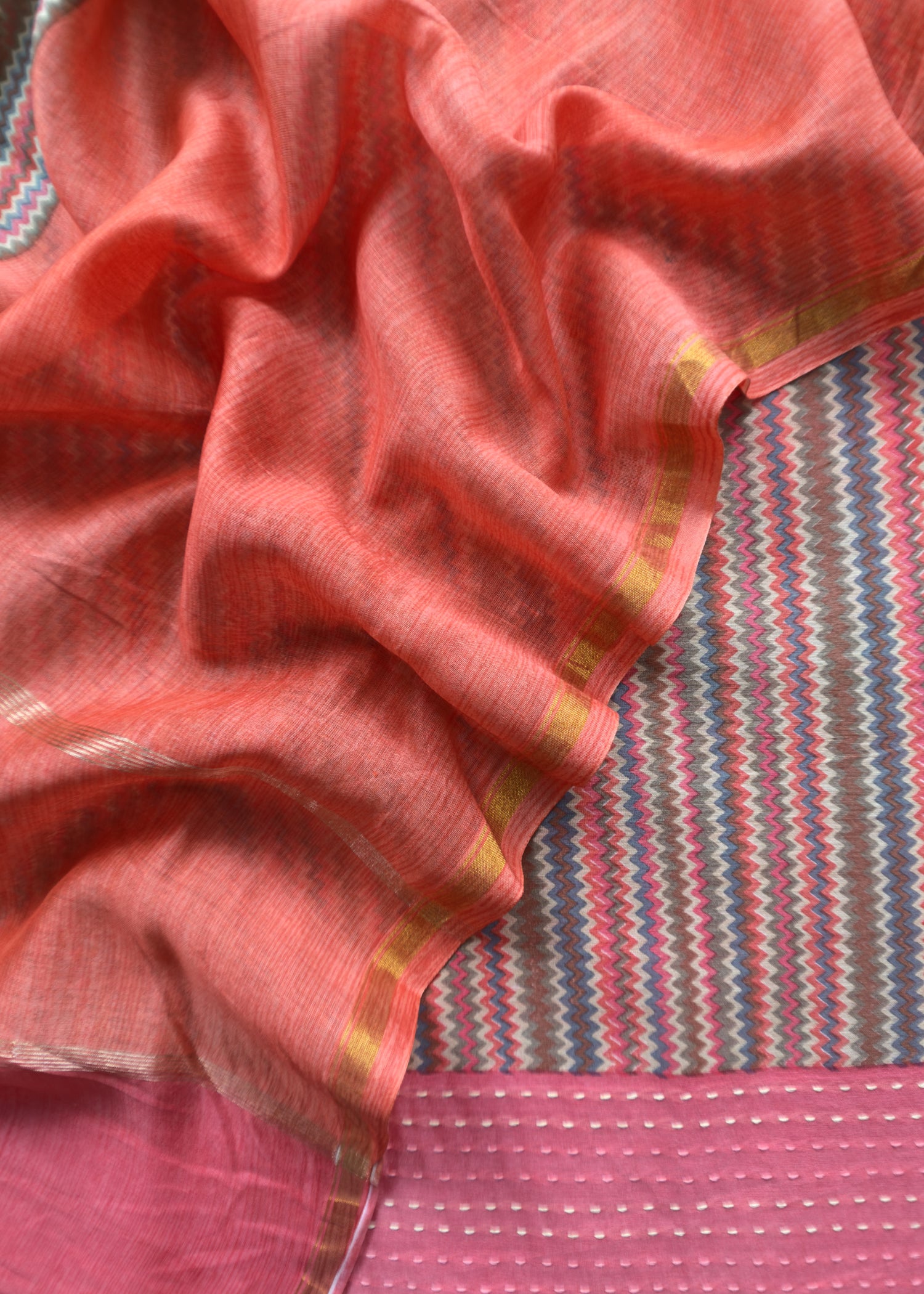 Indian Gajari Pure Maheshwari Silk Suit With Kantha Handwork