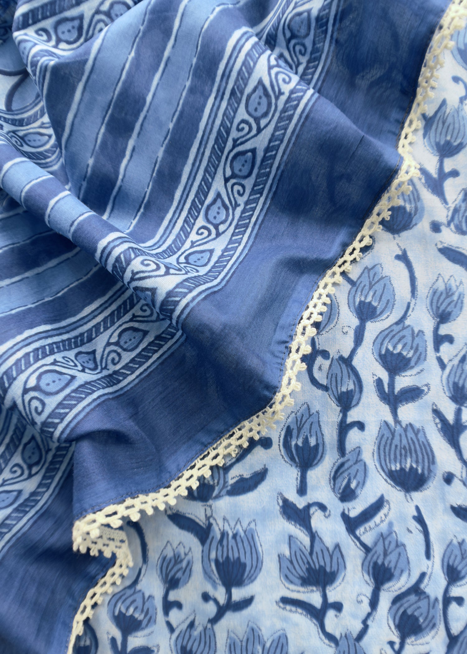 This pure cotton suit features an elegant hand-block print all over the kurta, with lace work on the neckline. It is paired with a pure cotton dupatta with crochet lace borders and printed cotton bottom.