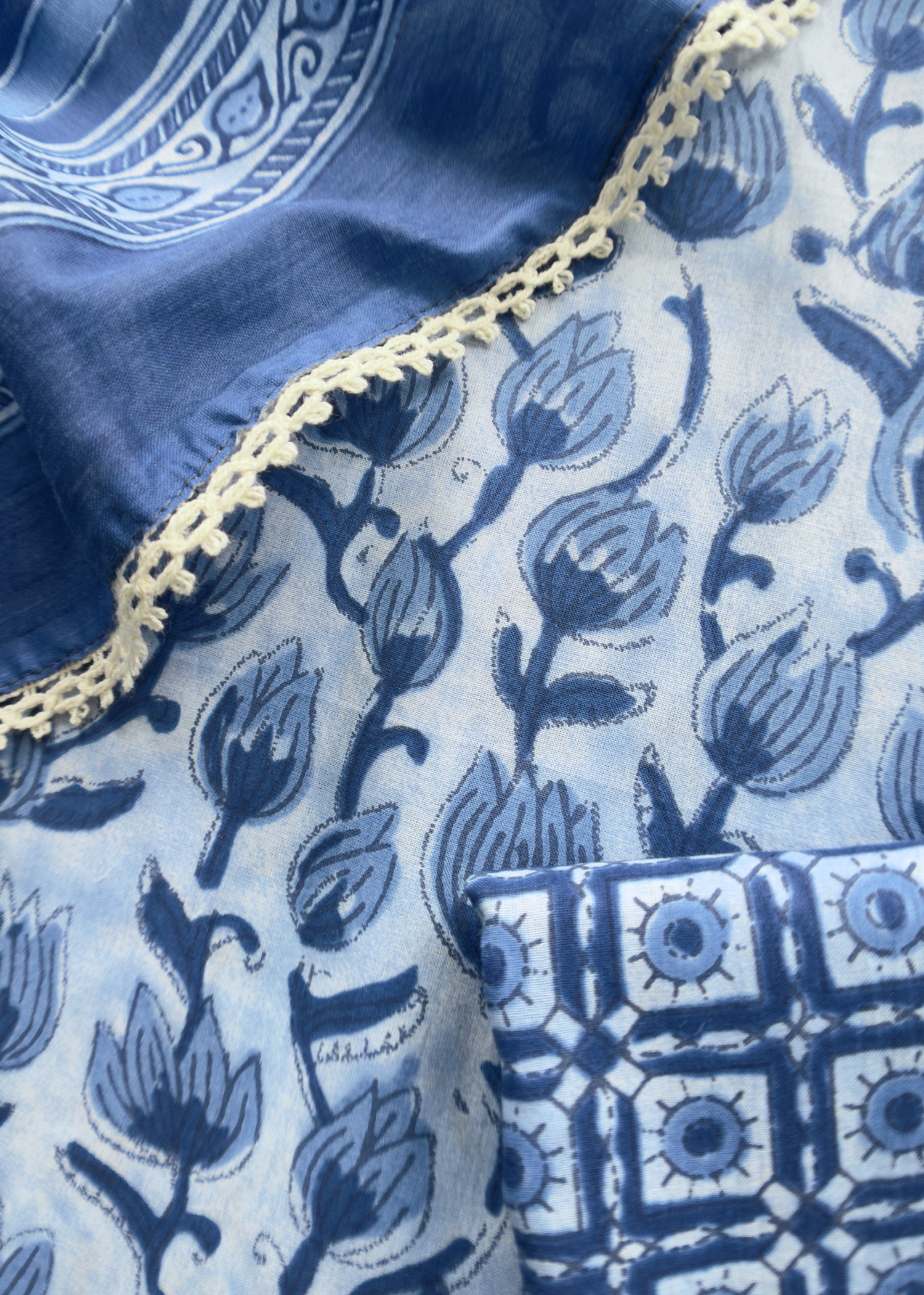 Indigo Blue Hand Block Suits Fabric In Pure Cotton