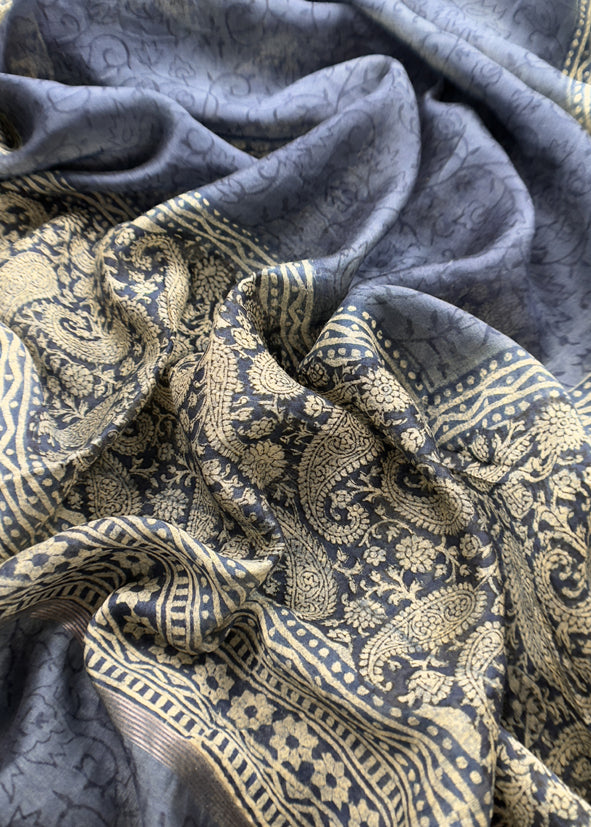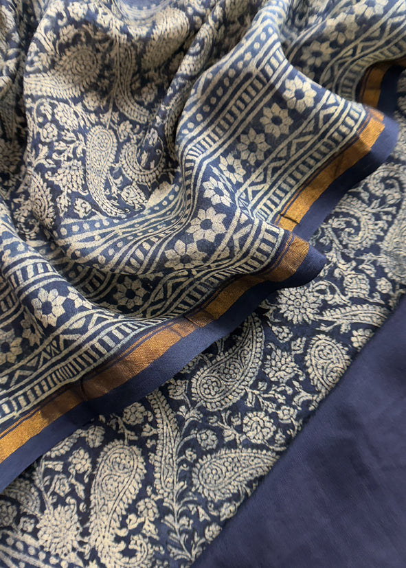 Indigo Paisley Block Print Pure Maheshwari Silk Unstitched Suit Fabric