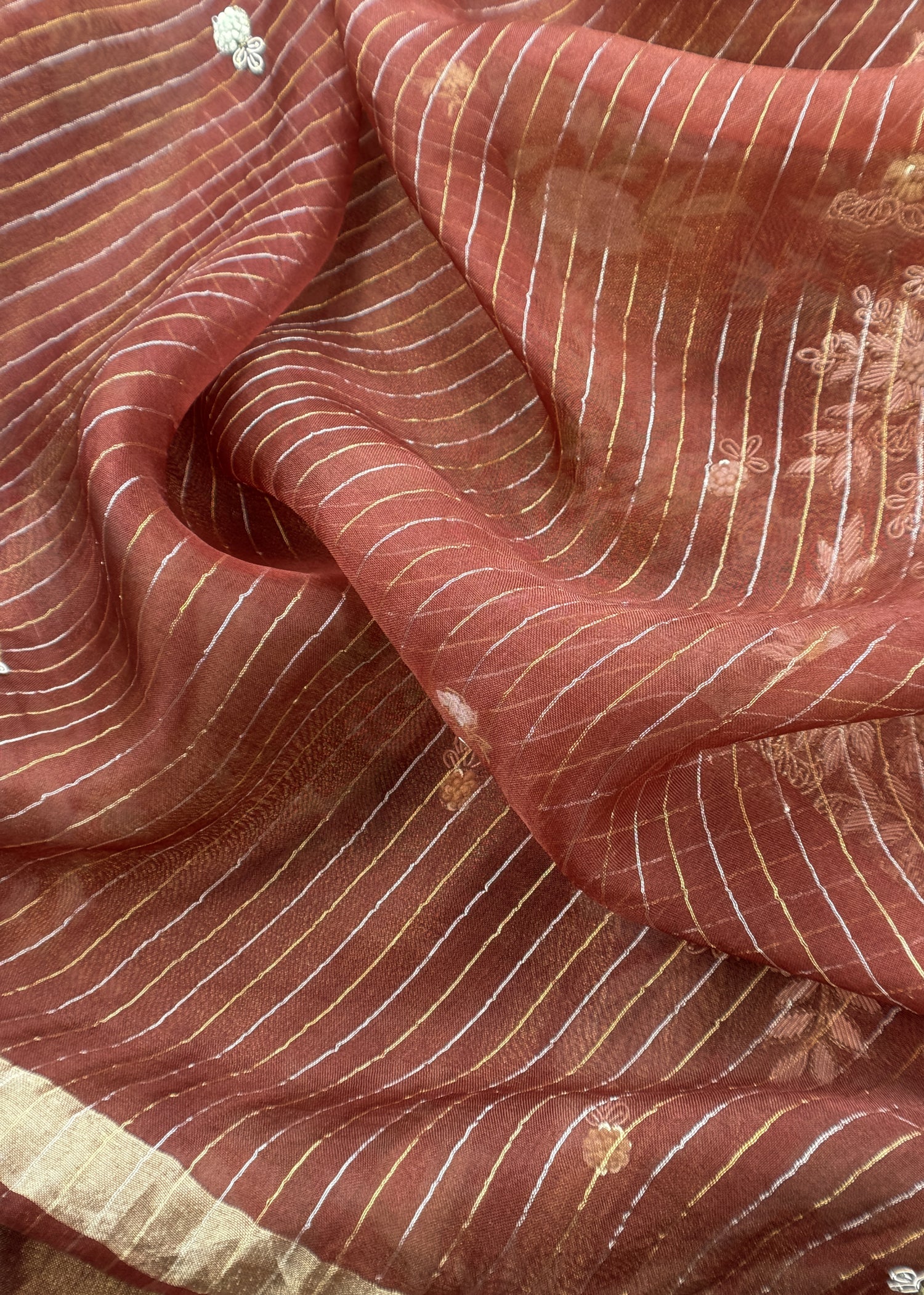 Matching pure organza dupatta has all over dabka bootis and scalloped sequin borders.