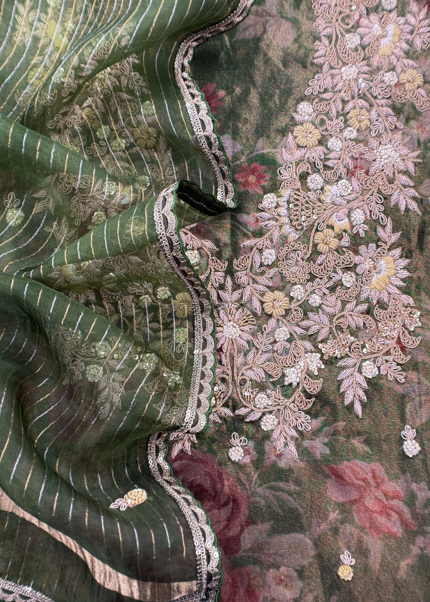 Matching pure organza dupatta has all over dabka bootis and scalloped sequin borders.