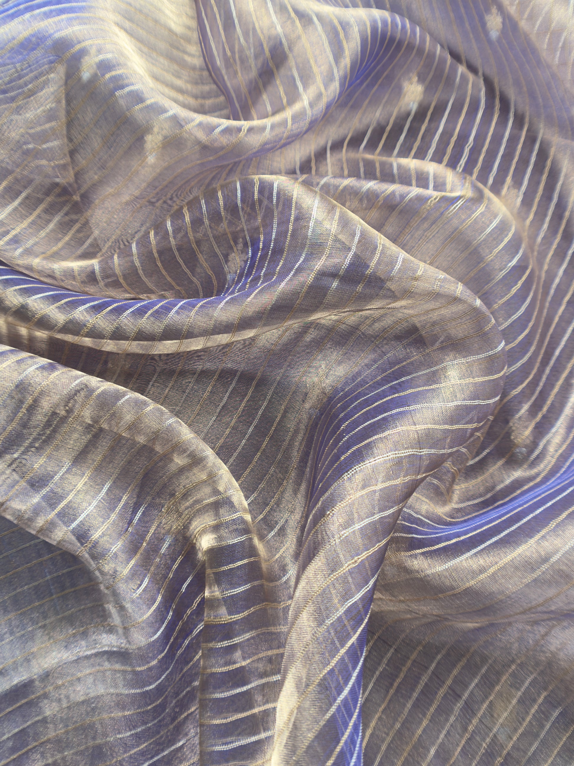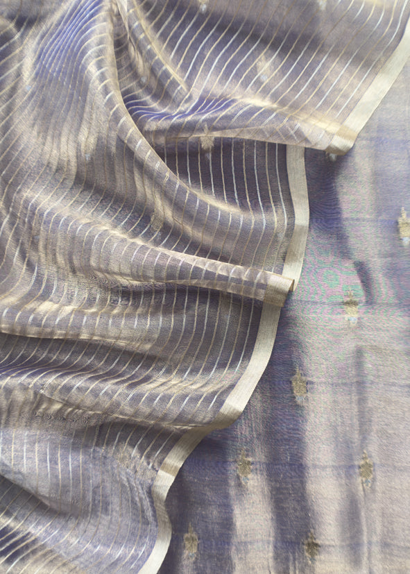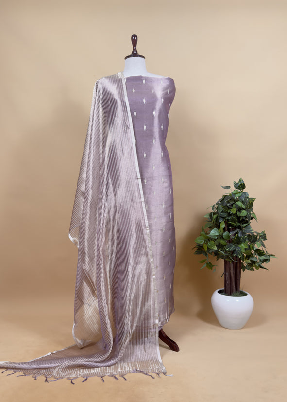Shop our exclusive handwoven Tissue kurta with elegant gold Banarasi bootis paired with handwoven tissue dupatta with gold silver lurex stripes and matching pure Chanderi bottom.