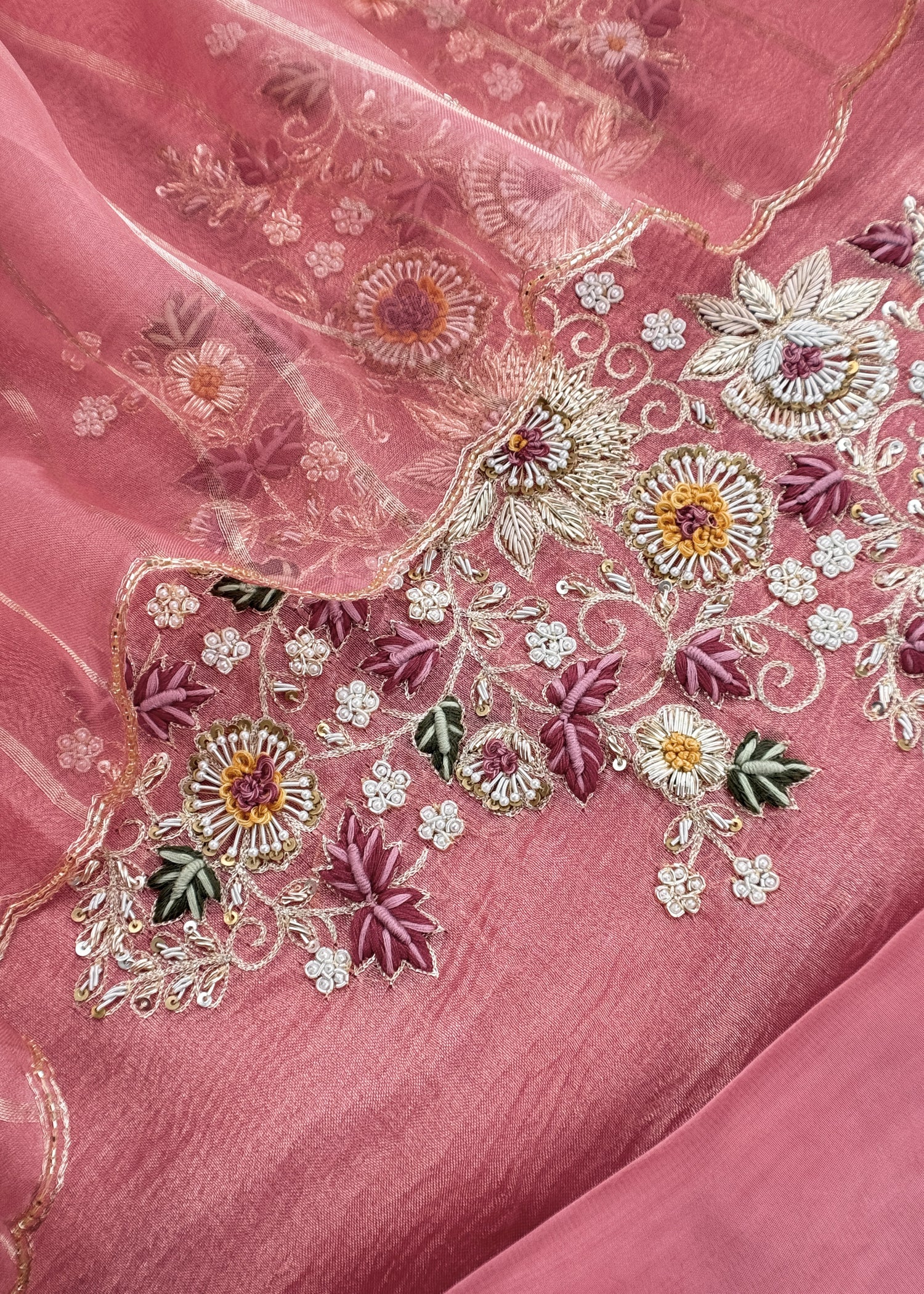 Matching pure organza lure. dupatta has all over dabka bootis and scalloped cutdana borders.