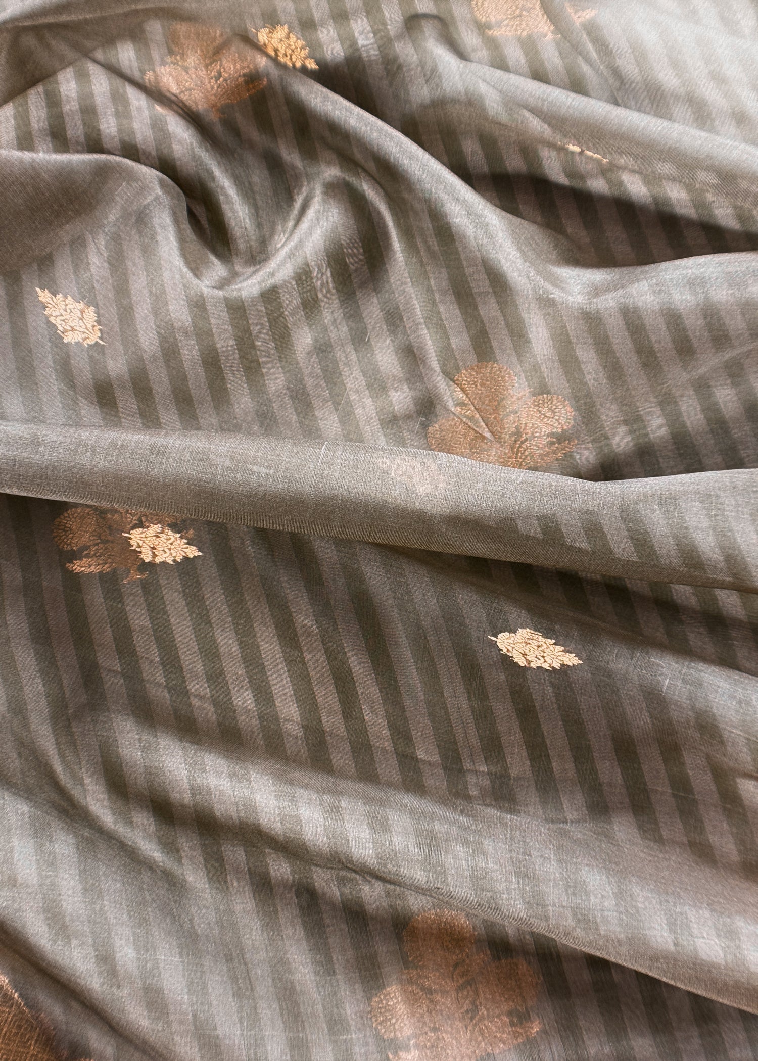 Classy and elegant striped katan silk kurta and bottom (6 metres) with kadwa weaving marigolds, borders for sleeves and lowers paired with matching handloom Kora silk dupatta with kadwa phool bootis and handmade tassels.