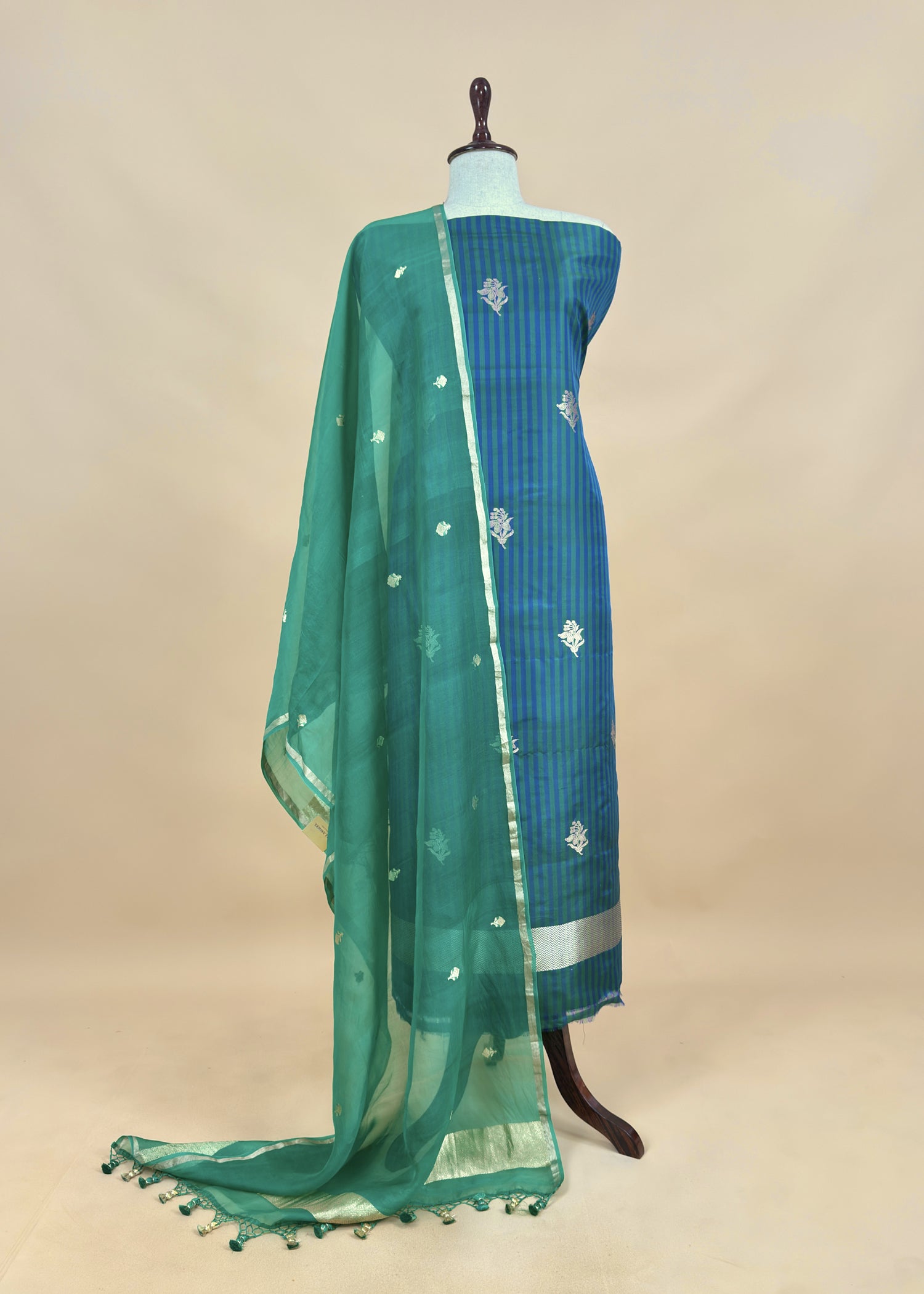 Classy and elegant striped katan silk kurta and bottom (6 metres) with kadwa weaving daffodils, borders for sleeves and lowers paired with matching handloom Kora silk dupatta with kadwa phool bootis and handmade tassels.