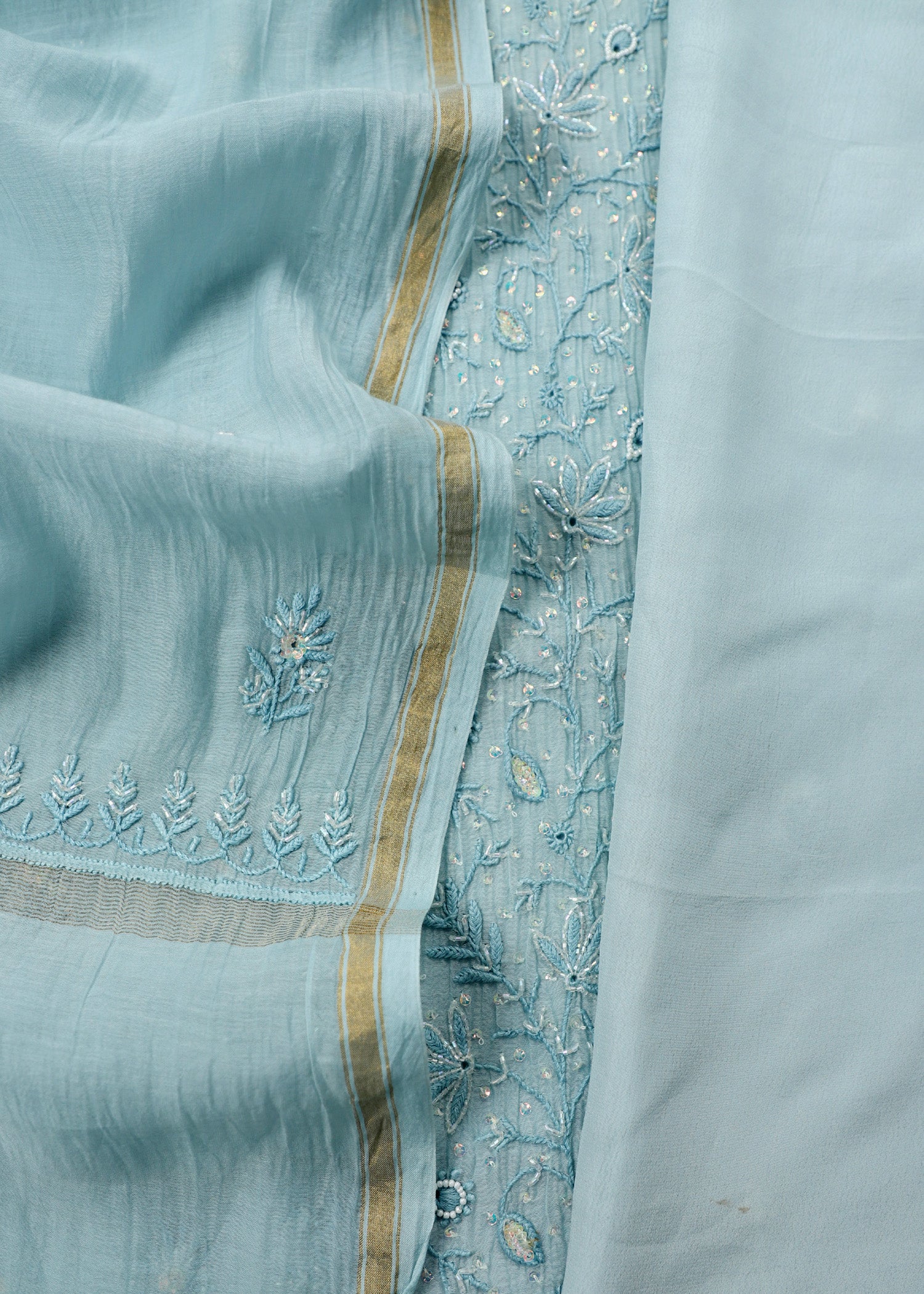 The kurta and dupatta feature ektaar ki hand chikan embroidery on the neckline, intricate floral embroidered jaal on the front panel, small floral embroidered bootis on the dupatta, along with embroidered borders and zari woven borders. Embellished with sequins, cutdana work, and mukaish patterns, this timeless suit guarantees you luxury, charm, and beauty.