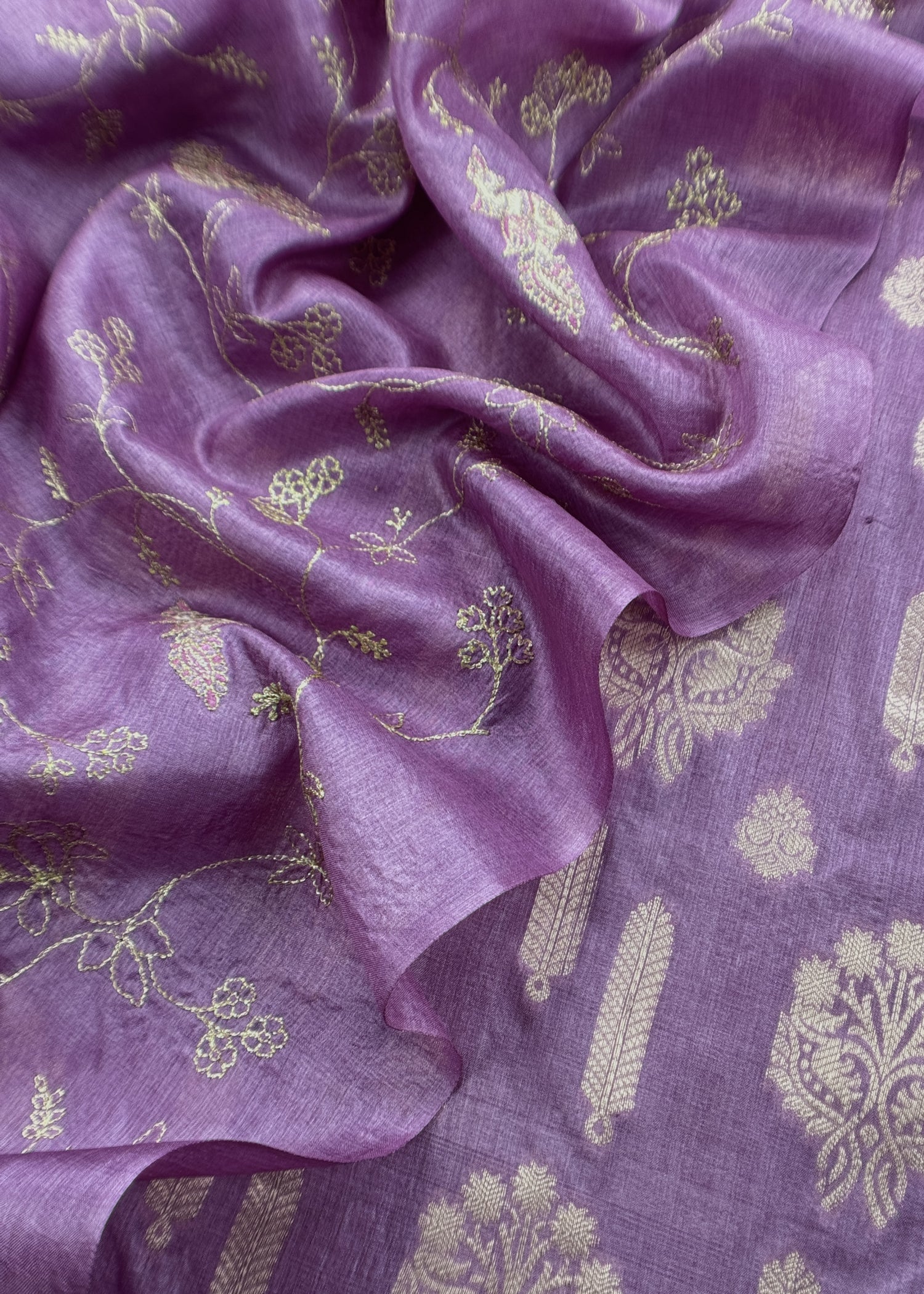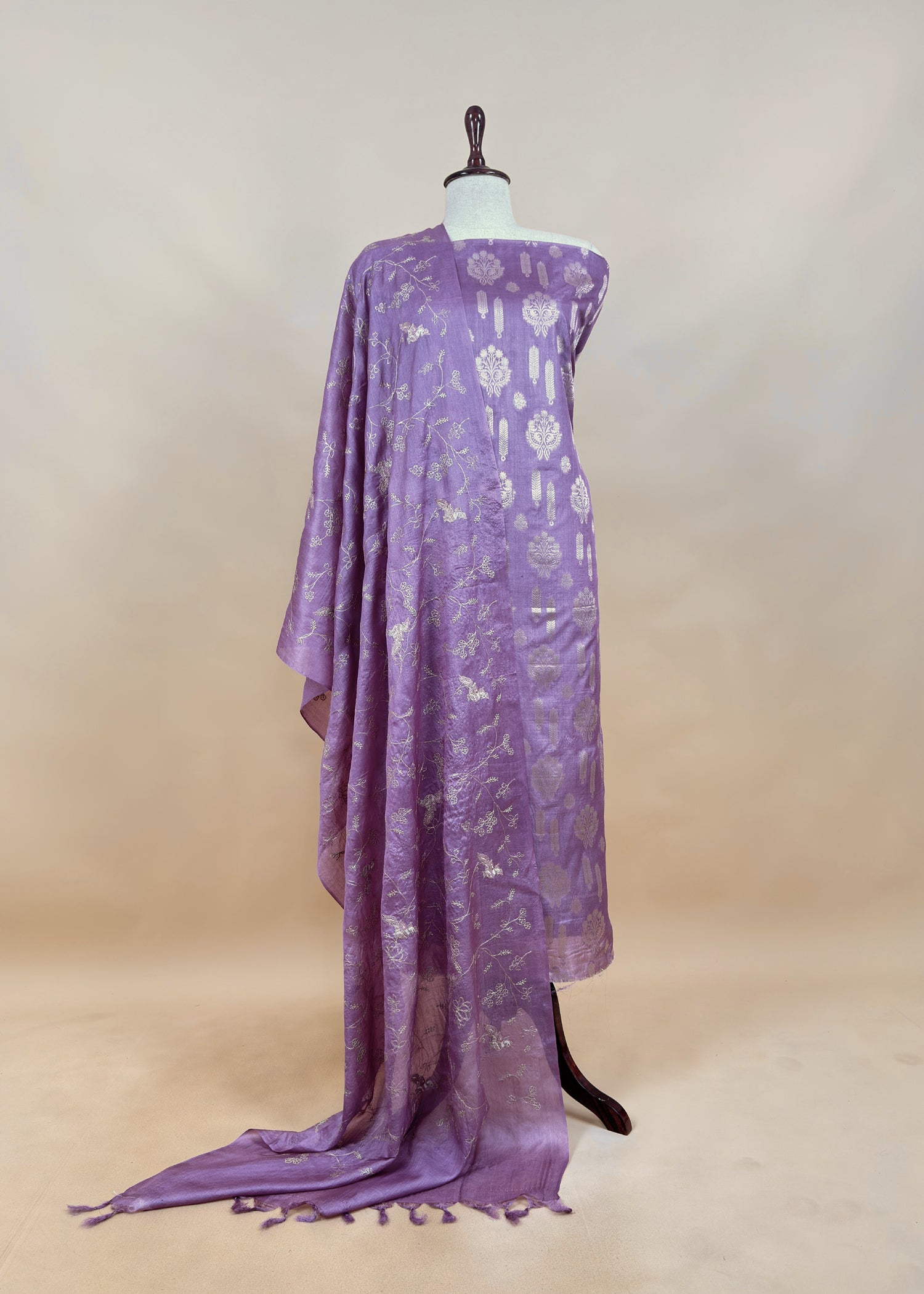 Levender Munga Tussar Suit With Zanarasi Zari Weaving And Pitta Work