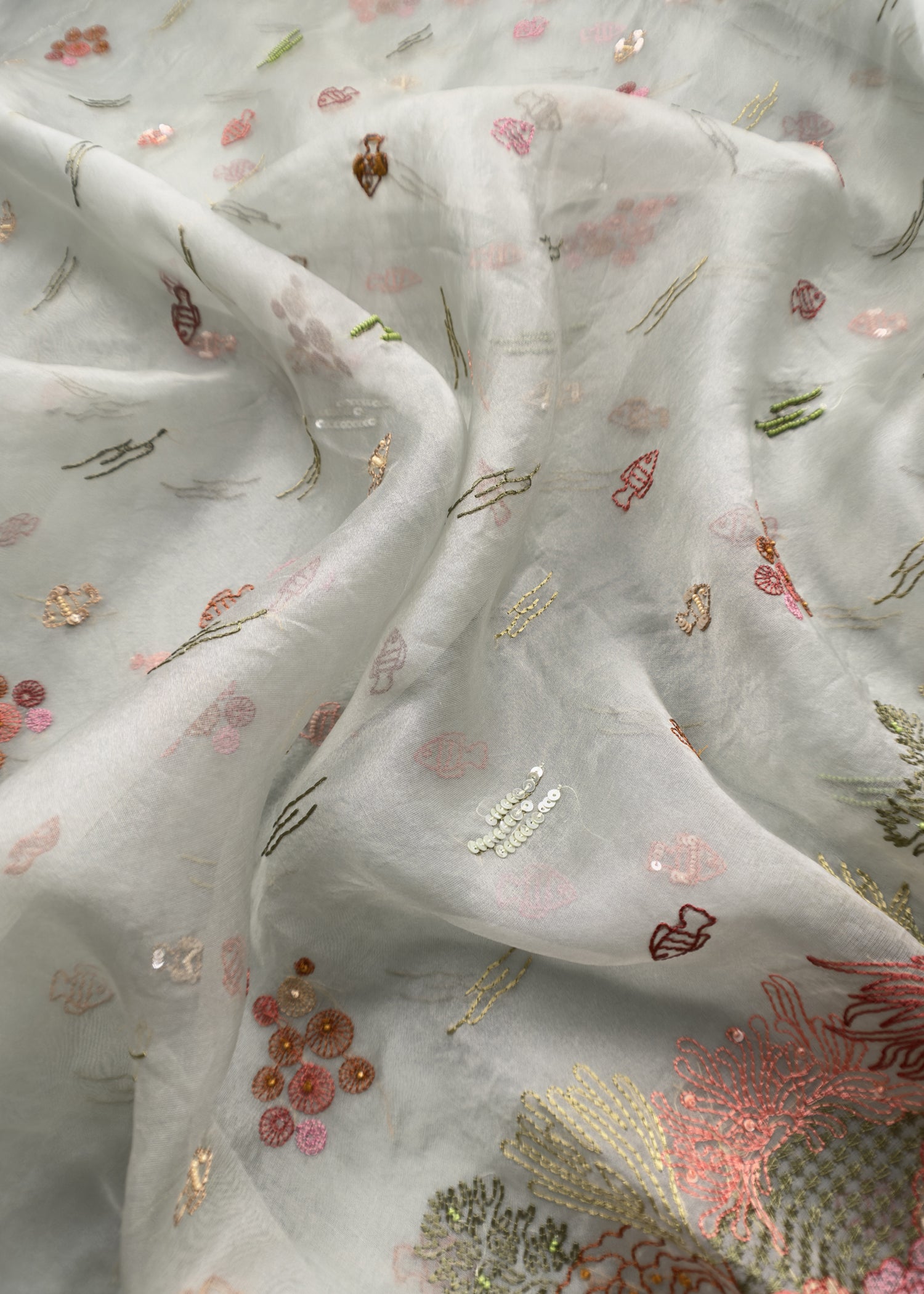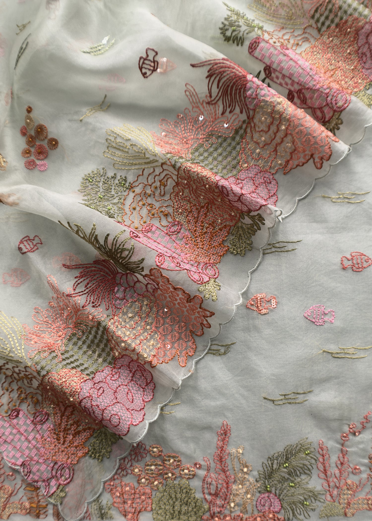 Shop our designer pure organza kurta and dupatta with all over multicolour embroidery, pearls, cutdana and sequins in marine plants and fishes with beautiful scalloping. The three piece suit comes with cotton satin bottom.