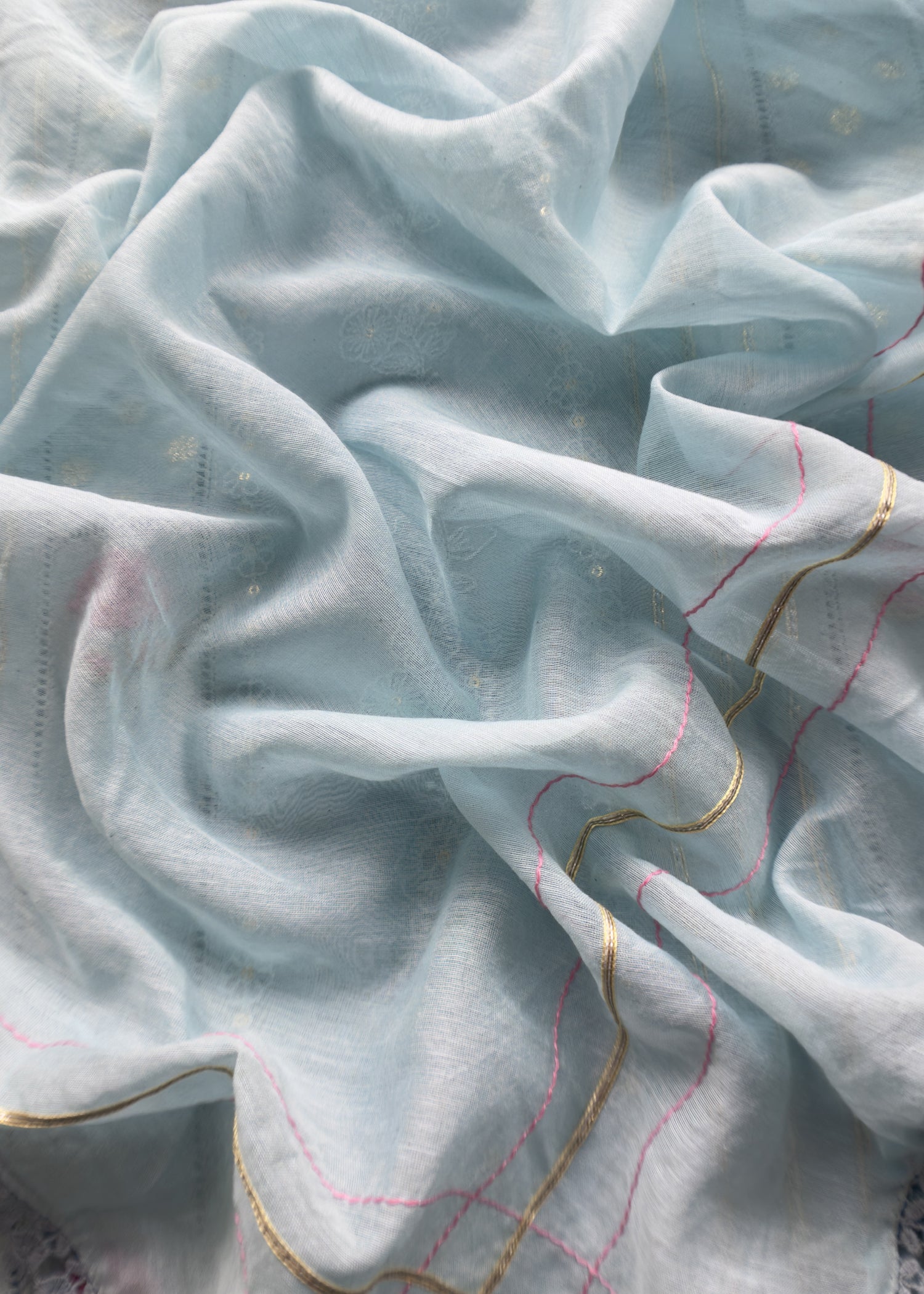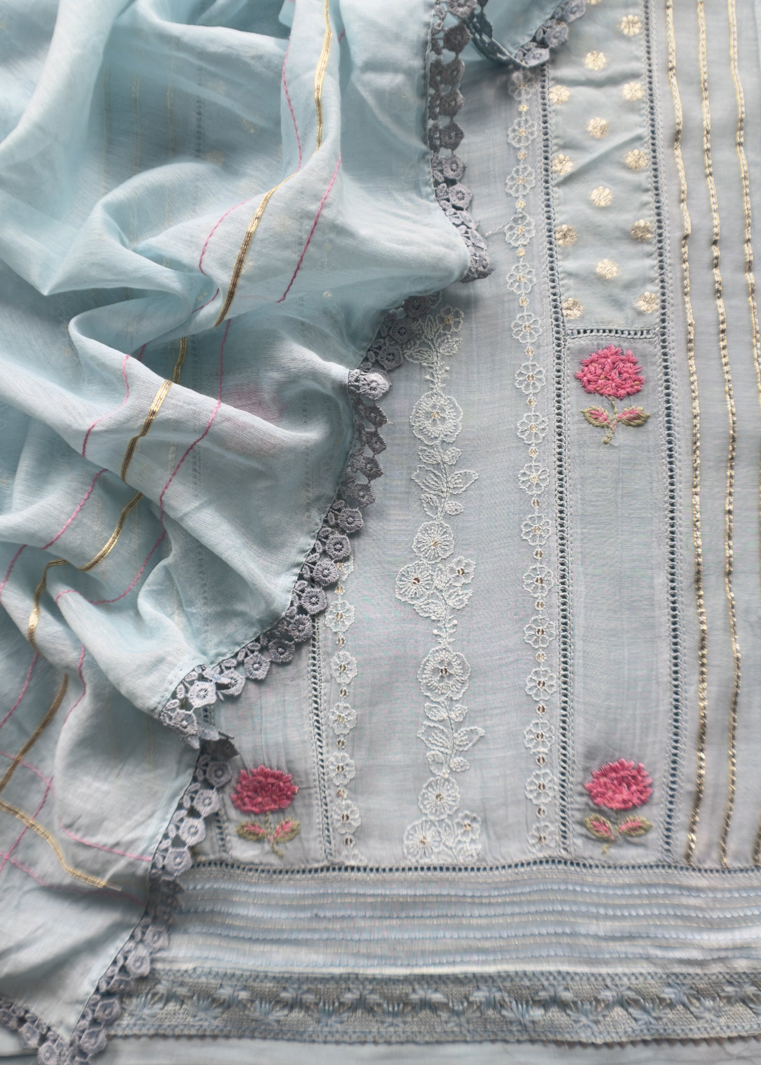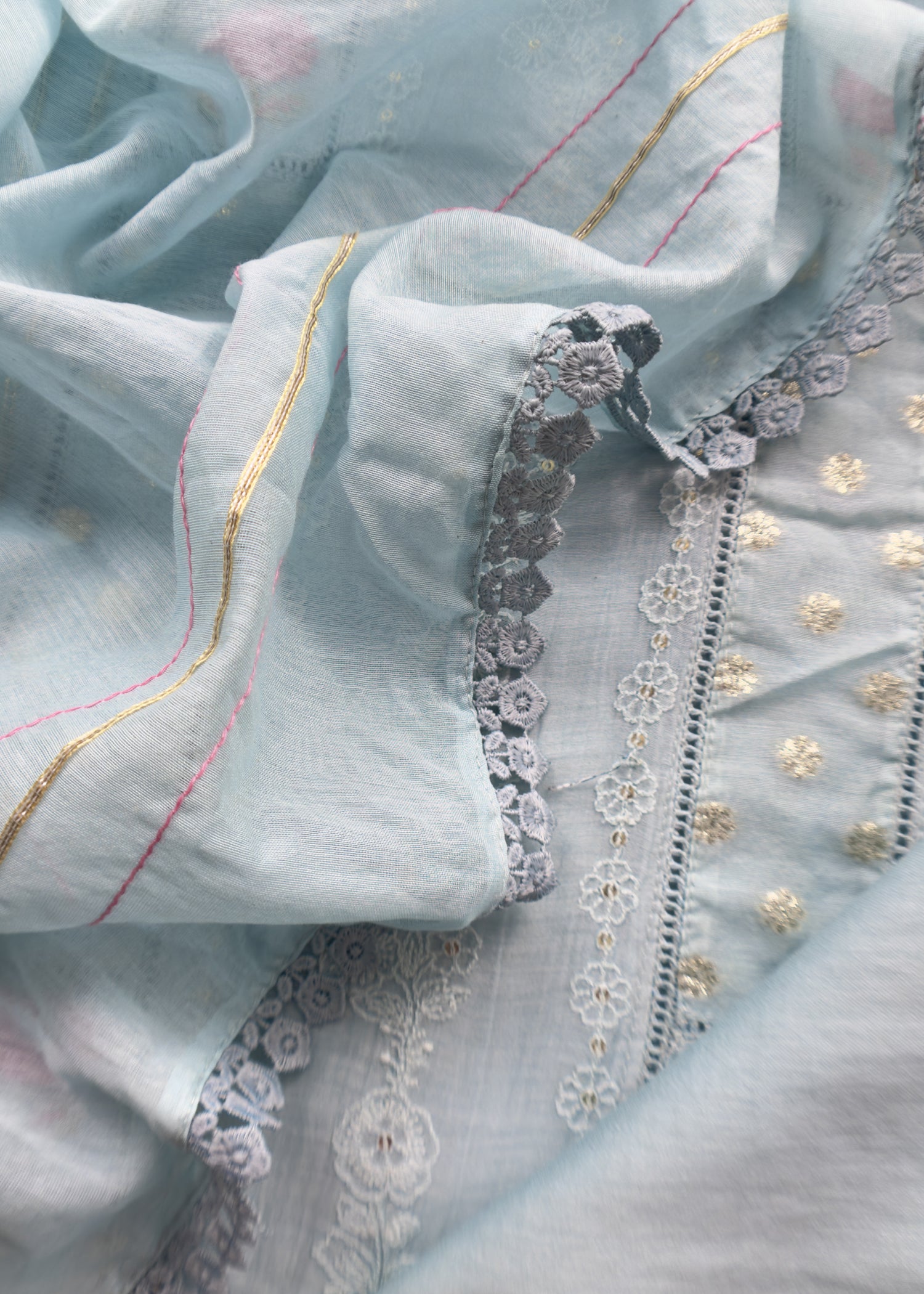Light Blue Pure Mul Suit With Gold Pitta Work And Resham Embroidery