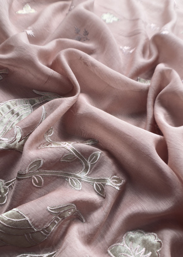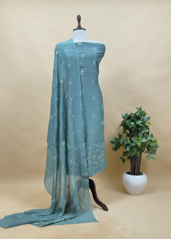 The pure mul Chanderi kurta is adorned with elegant tissue appliqué work and comes with a designer dupatta in pure mul Chanderi, along with a matching bottom in pure Chanderi.