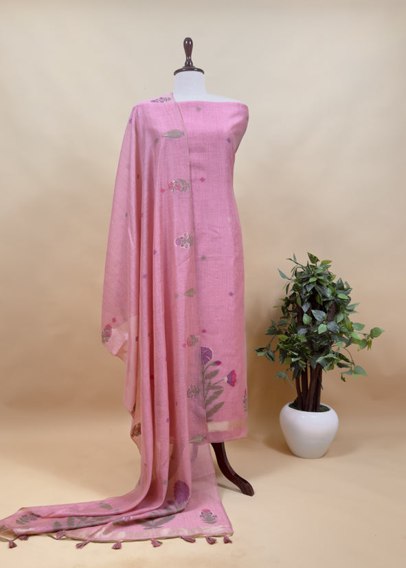 Designer made suit in Linen chanderi is embraced with fine phoolo wali jamdani weaving on the Ghera of kurta and pallu of the dupatta. Handmade tassels on the ends of dupatta gives the suit an unmatched appeal. The three-piece suit comes with plain bottom.