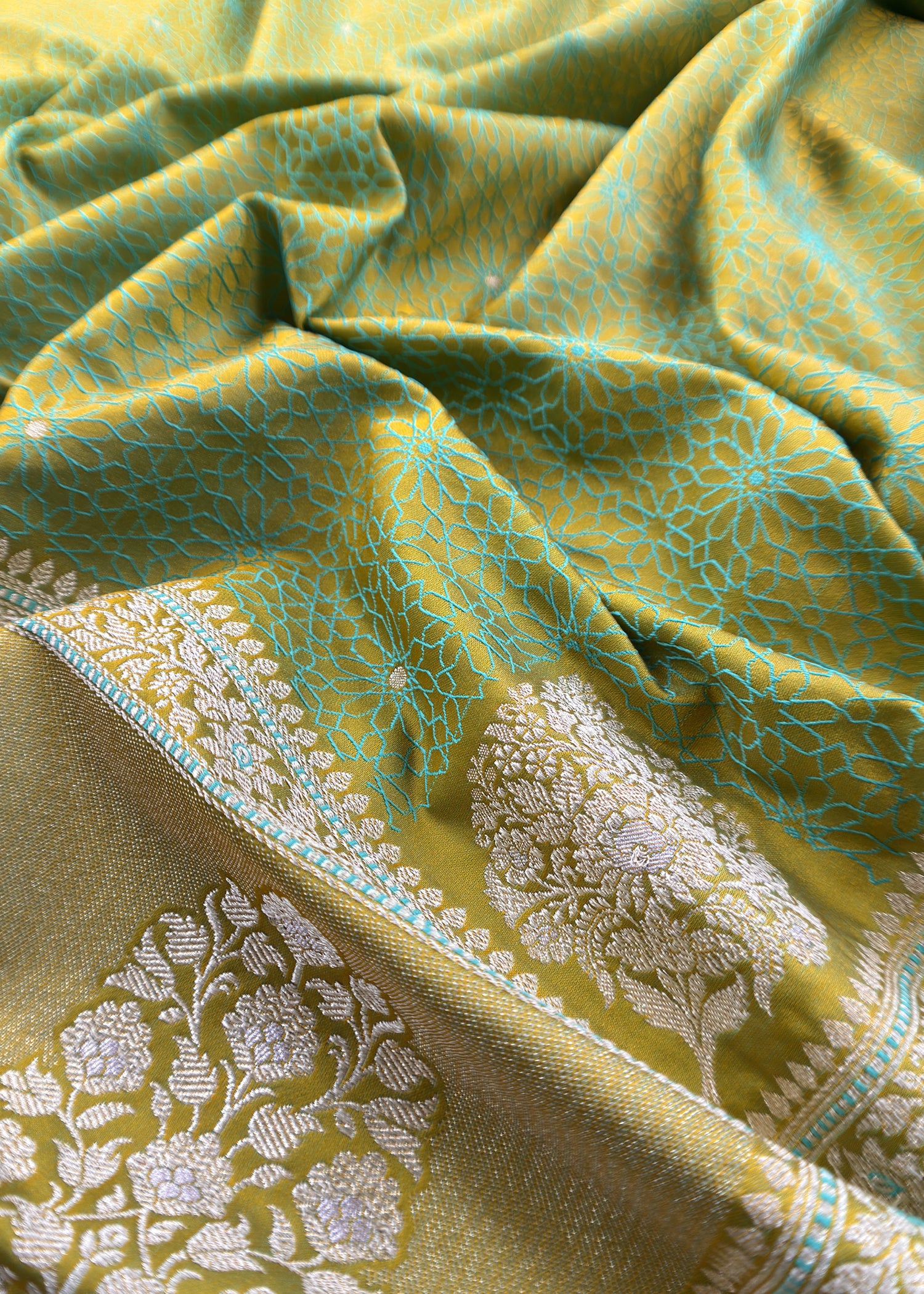 Pure Katan silk kurta in dhup chaav having meenakari zari woven phool bootis and daman border paired with meenakari phool jaal with elaborate borders and matching katan silk lowers.