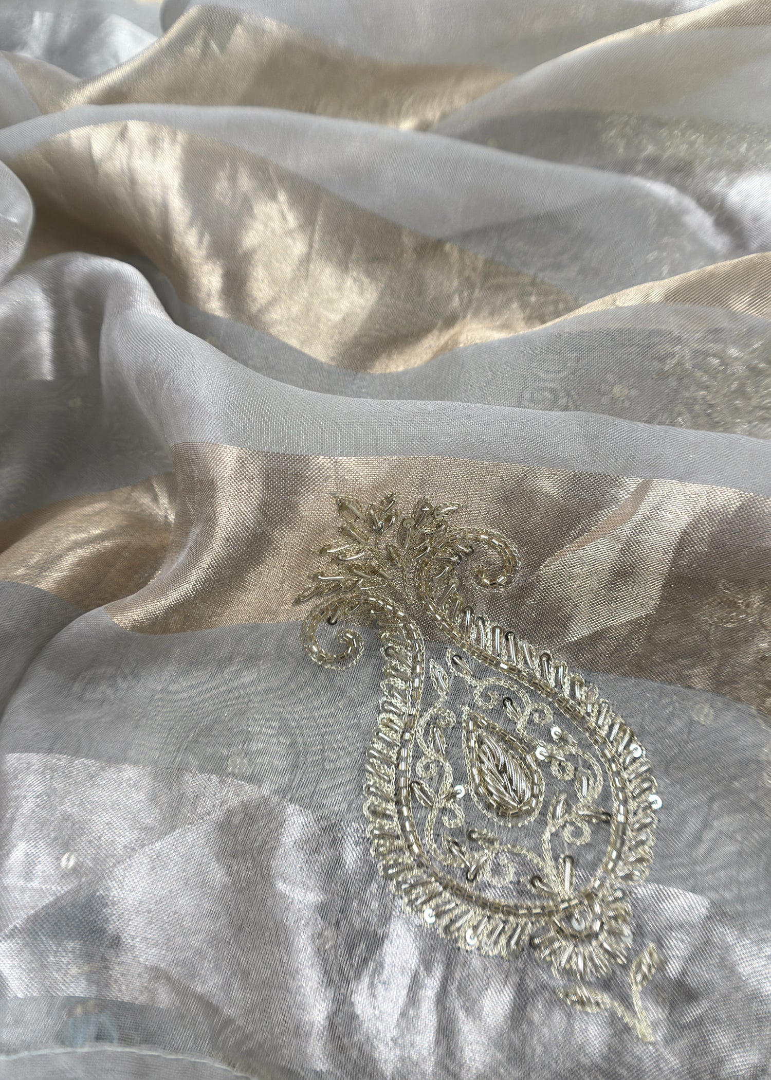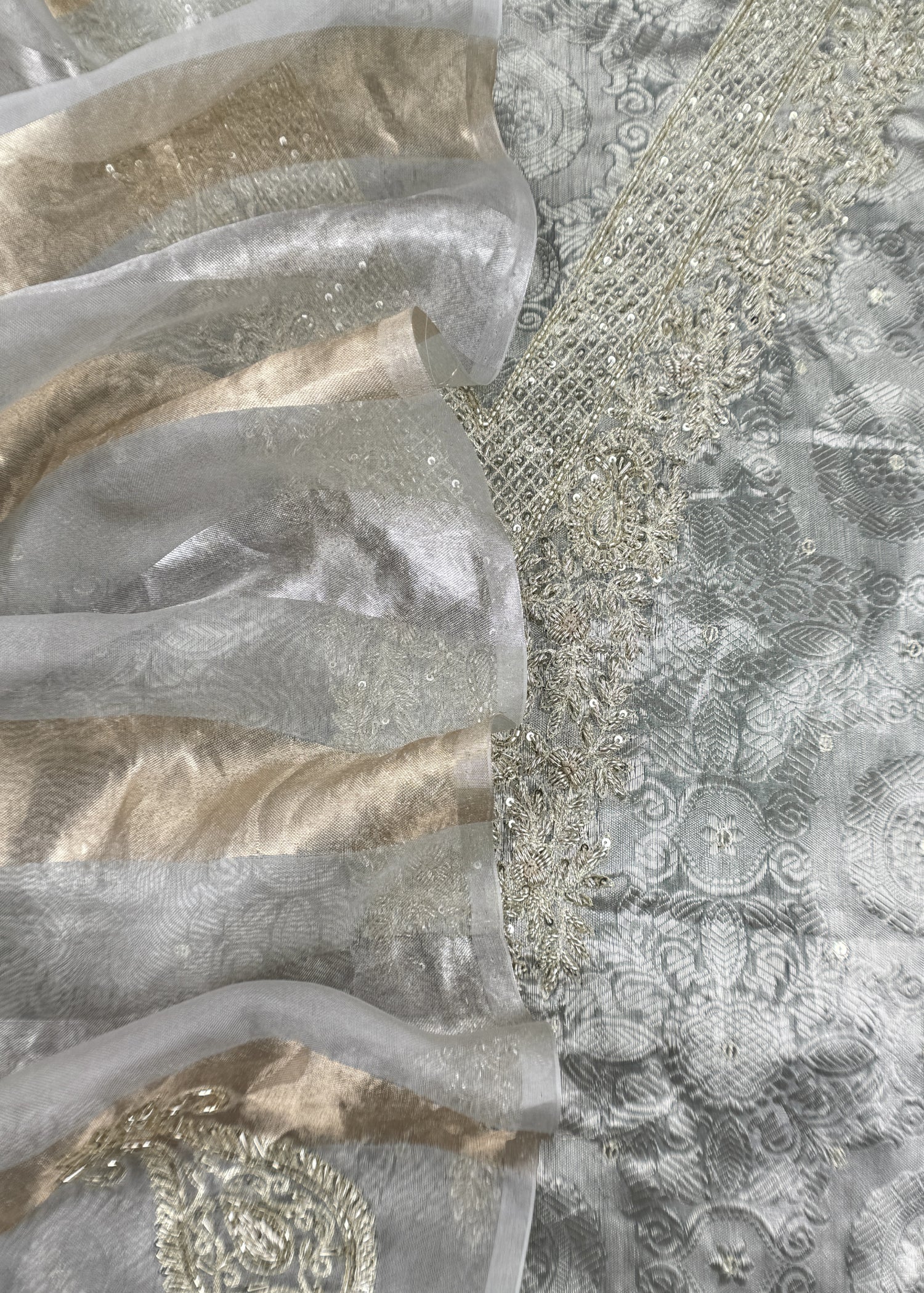 Light Grey Varanasi Brocade Silk Kurta And Double Panel Tissue Dupatta With Handwork