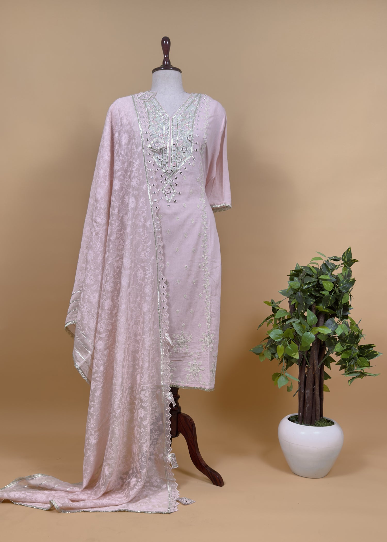 Stylish pure cotton kurta with fancy handwork on the neckline and front panels having mirrors, all over Dori embroidery, gota Patti kinari laces paired with Kota embroidered dupatta having gotapatti work in beautiful cutwork tassels with pure cotton bottom.