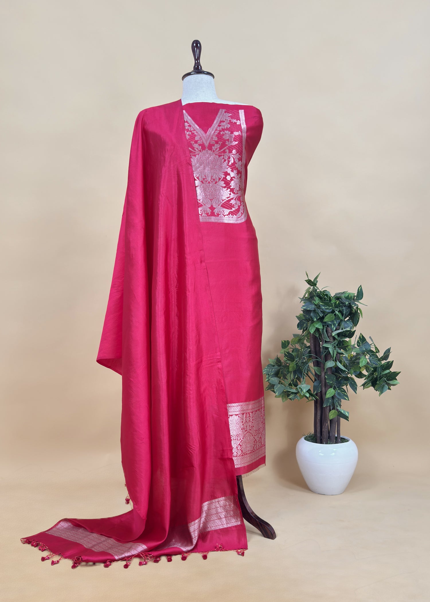 Pure katan silk kurta and dupatta adorned with gorgeous kadwa woven peonies neckline, beautiful daman, four-side borders with tassels paired with matching pure katan silk lowers.