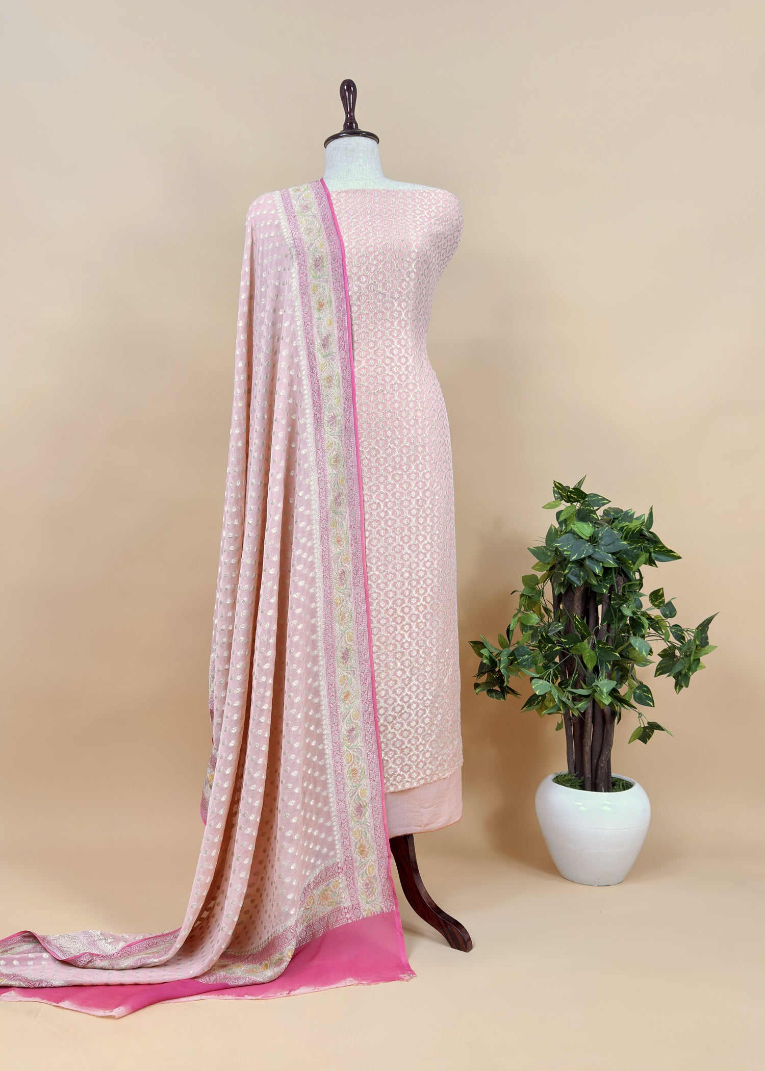 Luxe Baby Pink Khaddi Georgette Suit Fabric With Mughal Meenakari Weaving