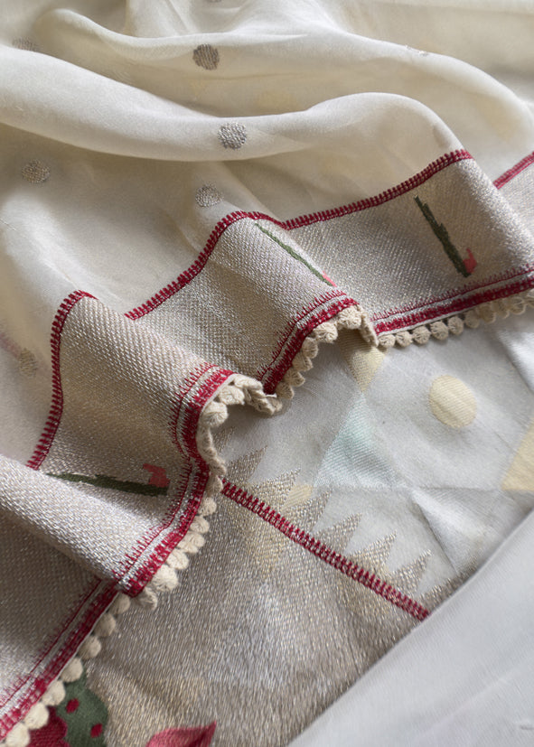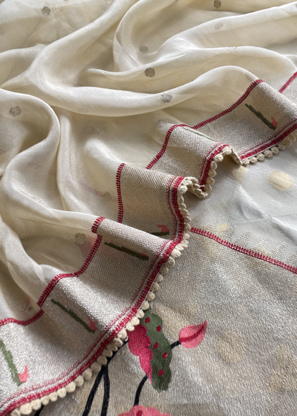 Shop premium Tissue Silk kurta and dupatta in self zari woven style and polka bootis adorned with paithani woven flamingo Daman and four side dupatta borders. The suit comes with matching crepe silk lowers.