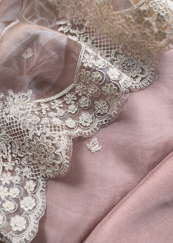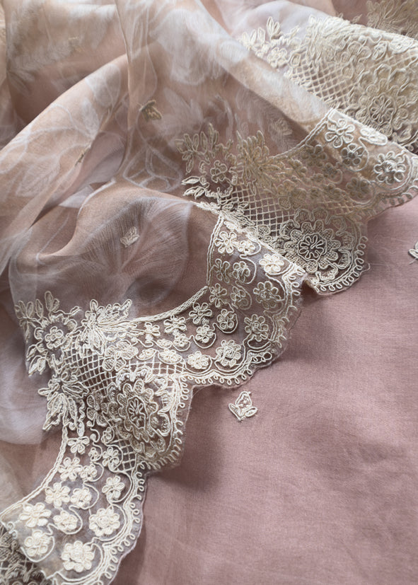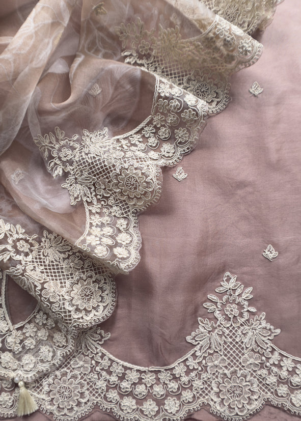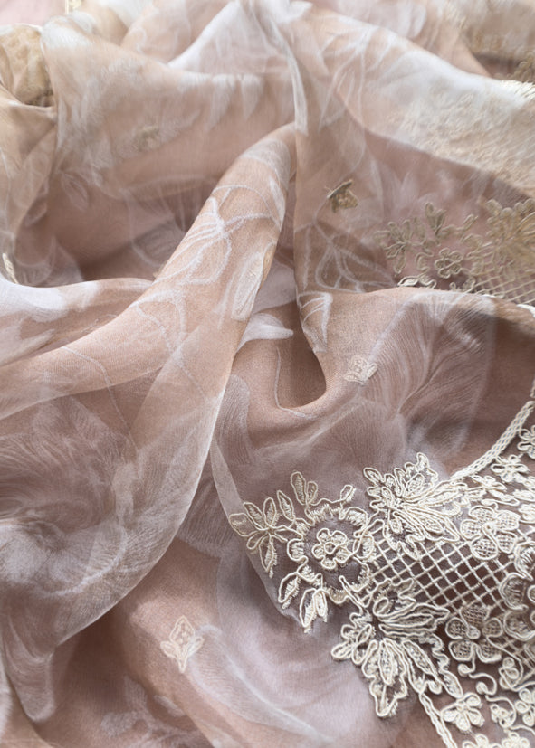 Get your hands on luxurious pure kora silk kurta and brushprint floral dupatta beautified with gorgeous delicate and elaborate French thread embroidered scalloped Daman and borders. Three-piece suit comes with matching pure crepe silk lowers.