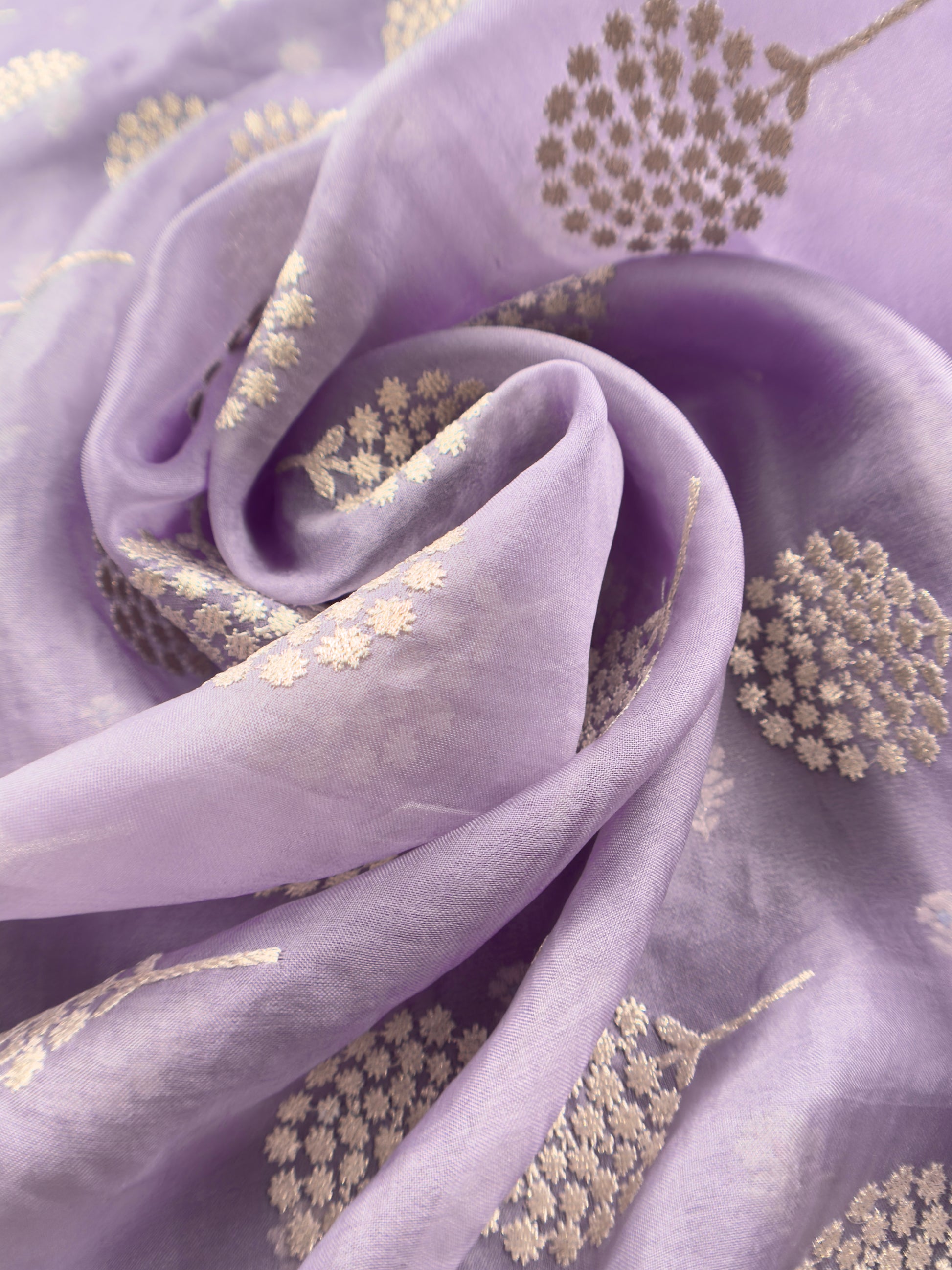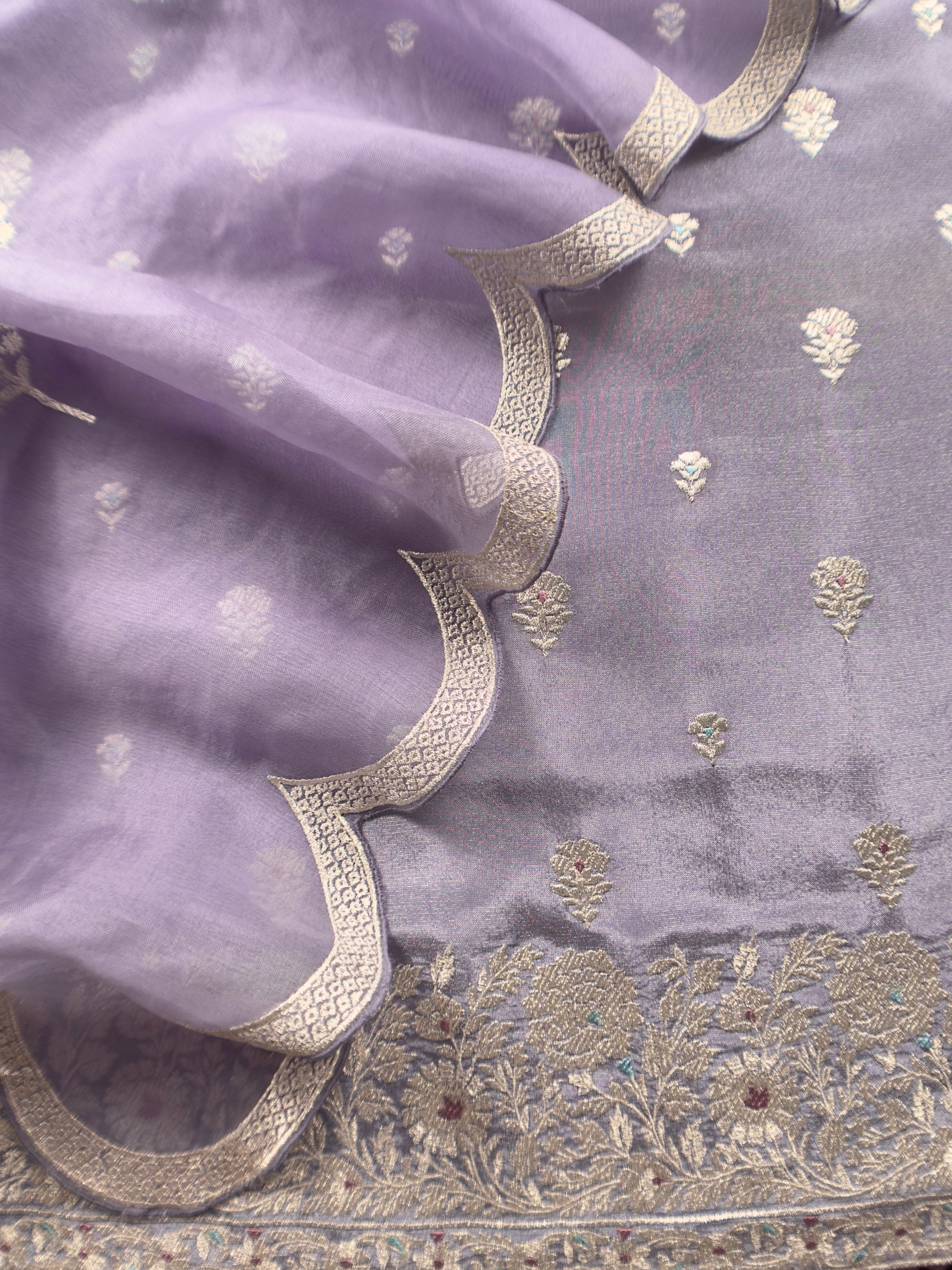 Shop premium handloom silk kurta and kora silk dupatta with gold zari ka daba hua work on all over phool bootis and elaborate borders on Daman, paisley bootis and detailed scalloping on dupatta. The suit comes with matching crepe silk lowers.