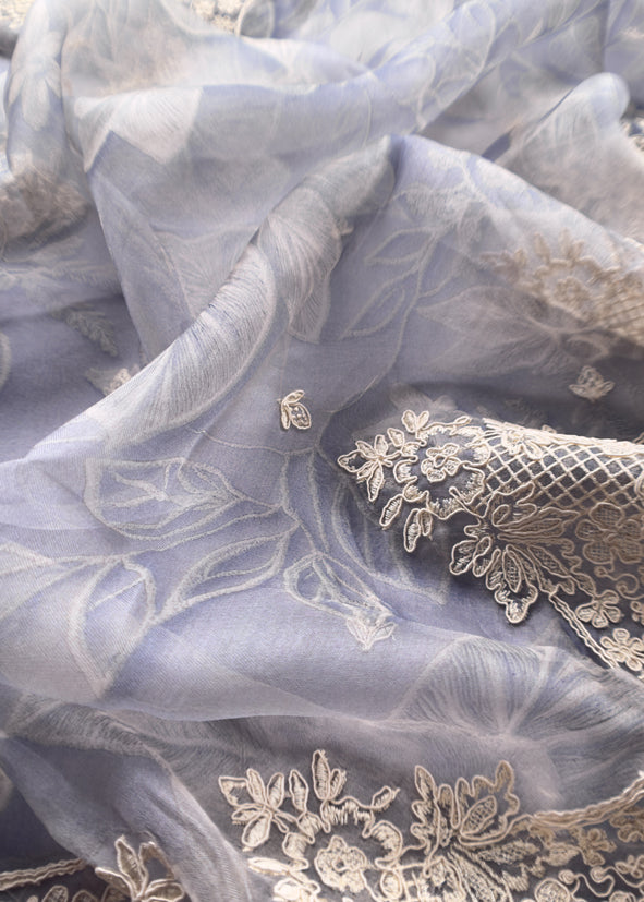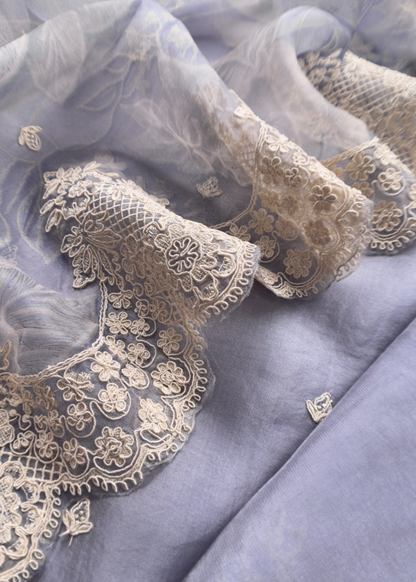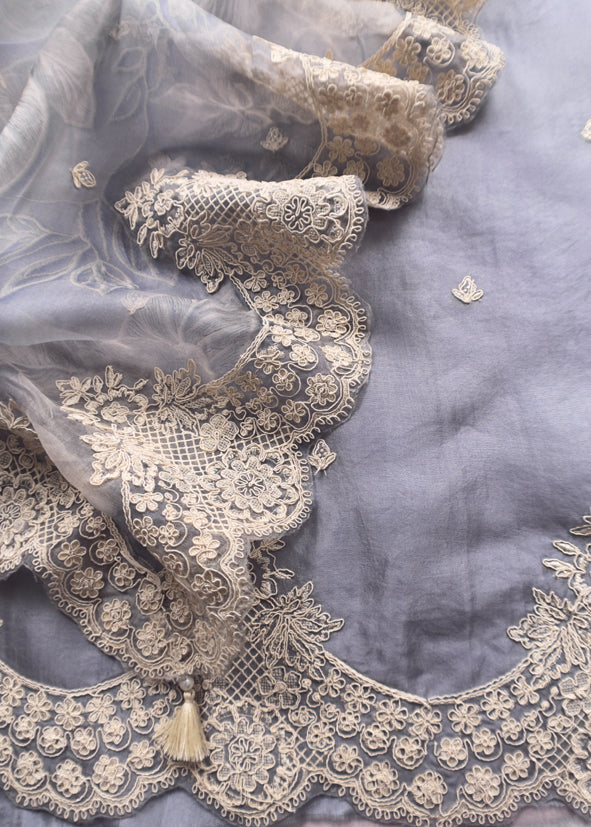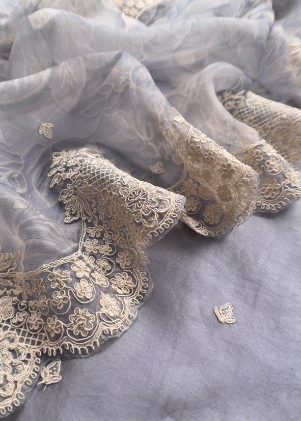 Luxe English Grey Blue Pure Kora Silk Suit With Brushprint And French Thread Embroidery
