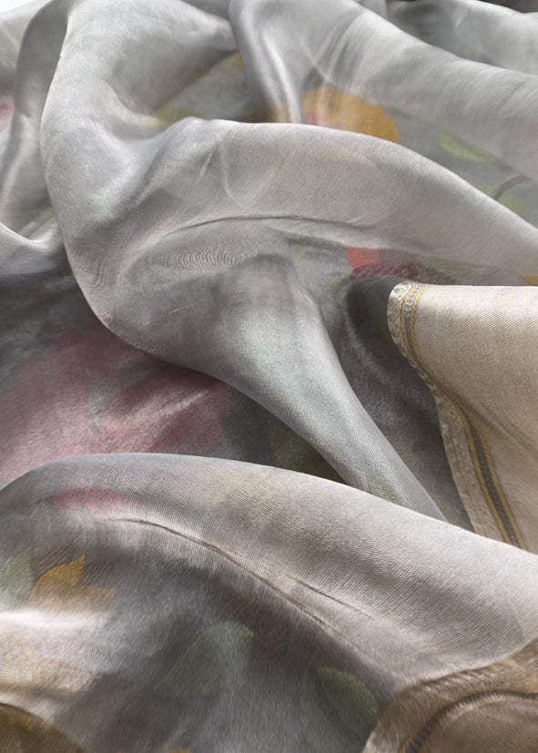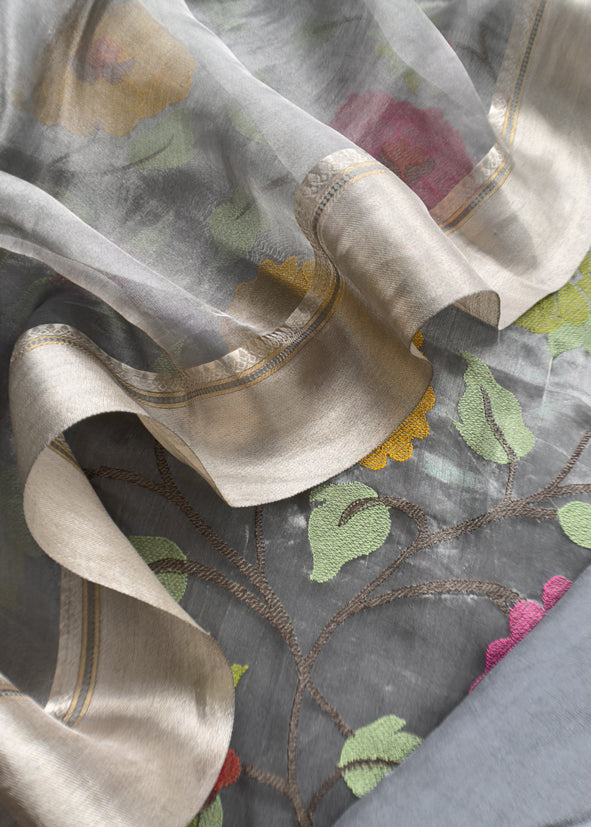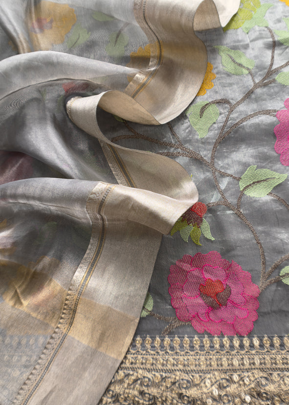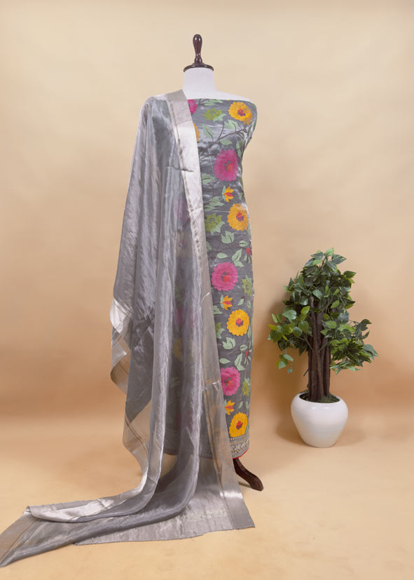 Luxe Steel Gray Handloom Tissue Silk Suit With Sequin And Bharwa Resham Embroidery