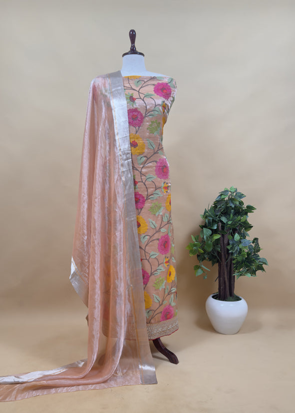 Shop premium handloom Tissue Silk kurta and Dupatta adorned with all over phoolo wali bharwa embroidery and sequin Patti Daman and zari woven borders. The suit comes with matching pure crepe silk lowers.
