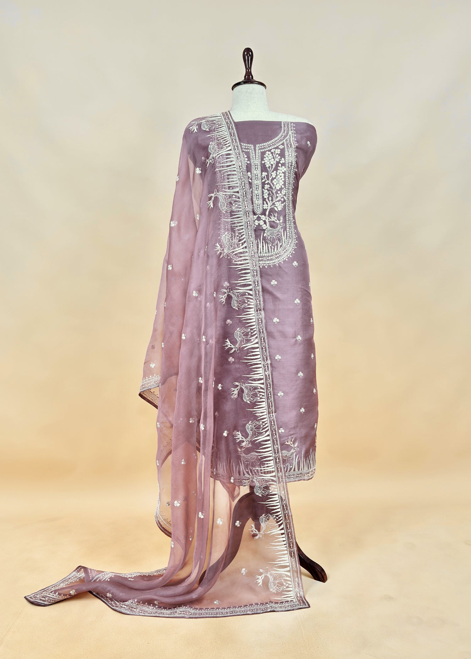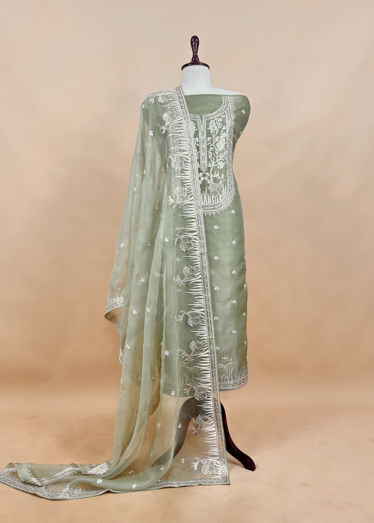 Handloom Kora silk kurta and dupatta enhanced with gorgeous gold silver pitta handwork front neckline, all over bootis, elaborate Daman, four-side dupatta borders with lovely deer detailings. The three-piece suit comes with matching crepe silk lowers.